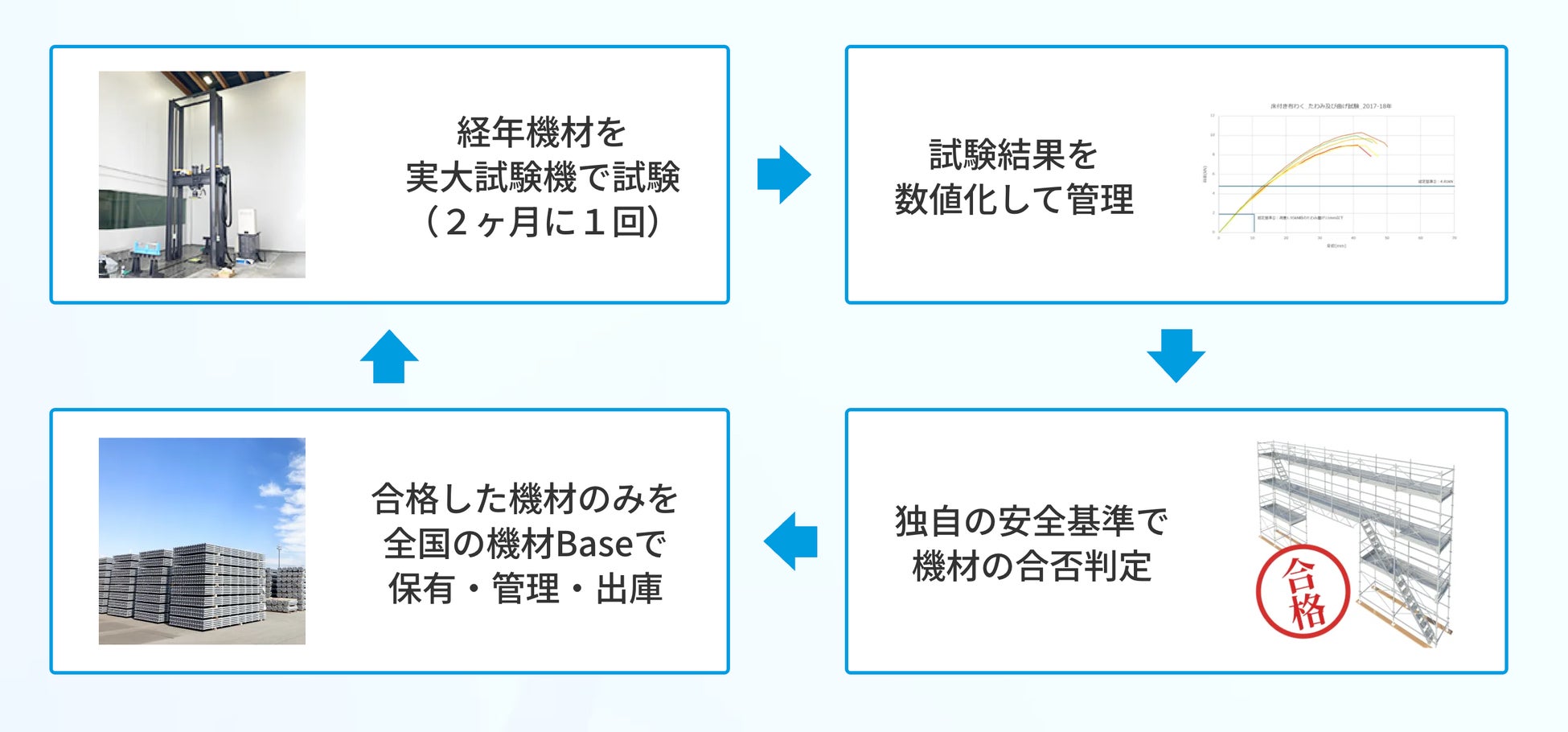 足場をはじめとする建設業界のプラットフォーマーとして、業界課題に革新的なソリューションを創造しつづける株式会社タカミヤ(以下タカミヤ、大阪本社:大阪市北区、東京本社:東京都中央区、代表取締役会長兼社長:髙宮一雅)は、経年仮設機材の安全性(強度・耐久性)を、実大試験機による定期試験で数値化し、独自の安全基準を設定します。また、この基準に合格した安全性の高い機材のみを、全国29カ所の機材拠点(機材Base)から現場に提供する仕組みとして「経年機材管理フロー」を構築しました。