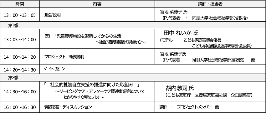 今回のイベントでは、退所後の生活実態について社会的養護経験者の声に耳を傾けていきます。その上で、社会的養護自立支援事業などの制度・政策の創設に携わったこども家庭庁担当者より、現在、活用できる社会的養護自立支援事業等の社会的養護自立支援の推進に向けた取組みについて、詳細を分かりやすく解説していただきます。