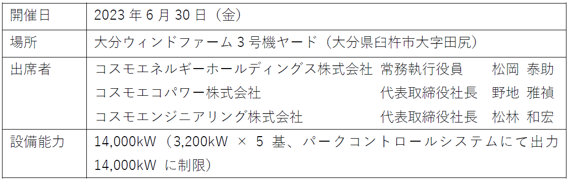 コスモエネルギーホールディングス株式会社(代表取締役社長:山田 茂)の子会社であるコスモエコパワー株式会社(代表取締役社長:野地 雅禎)は、2023年4月10日より商業運転を開始した大分ウィンドファームについて、2023年6月30日、地元関係者や工事関係者の皆様にご参列をいただき、操業安全祈願祭を執り行いました。