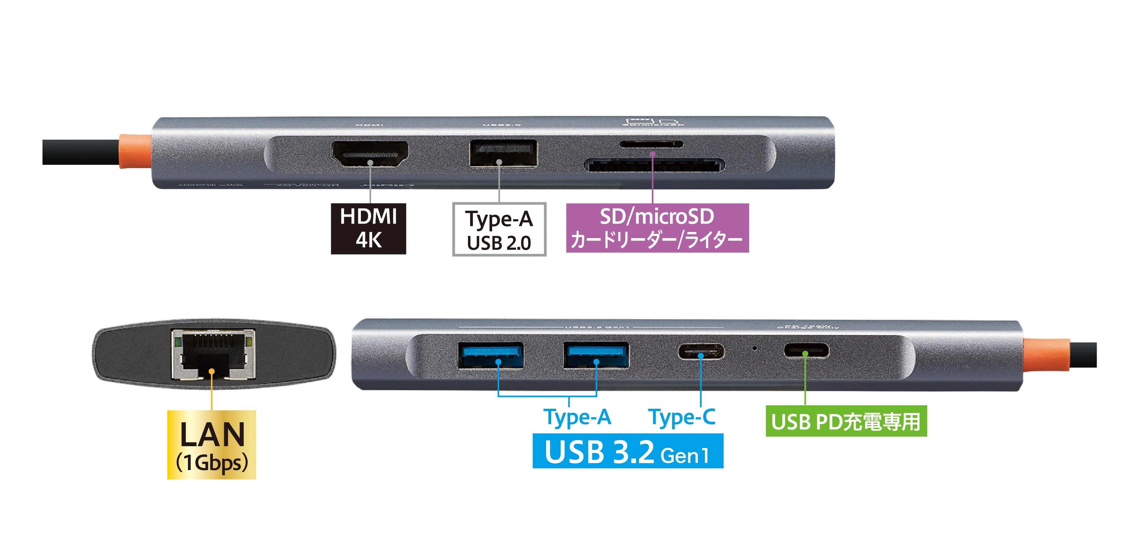 インターフェース | アップストリーム(PC側) :Type-Cオス ダウンストリーム(接続機器側):Type-Aメス×2(3.2Gen1) :Type-Aメス×1(2.0) :Type-Cメス×1(3.2Gen1) :Type-Cメス×1(PD充電専用) ※Alternate Modeには対応していません。 |