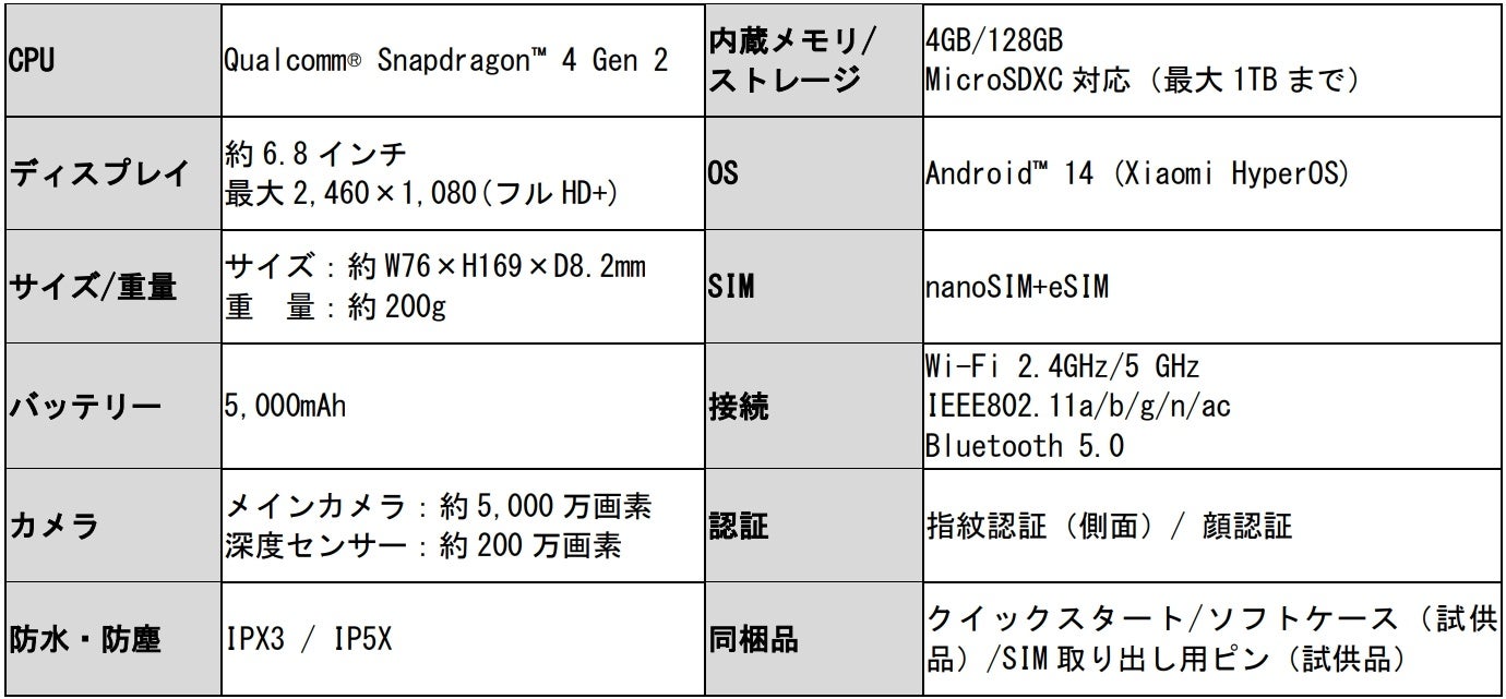 外観デザインは背面に高級感あふれるガラス素材を採用。処理性能に関しても、最新の4nm製造プロセス5Gチップセット「Qualcomm® Snapdragon™ 4 Gen 2」を搭載することで、省電力かつ快適な操作性を実現しています。3.5mmイヤホンジャックやFMラジオ、指紋認証/顔認証など日常をサポートする機能も充実しています。