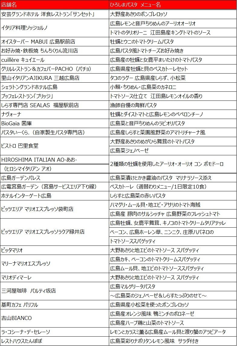 広島県名産の海産物や農産物使用の「ひろしまパスタ」を提供する外食店 27店舗31メニューを公開!