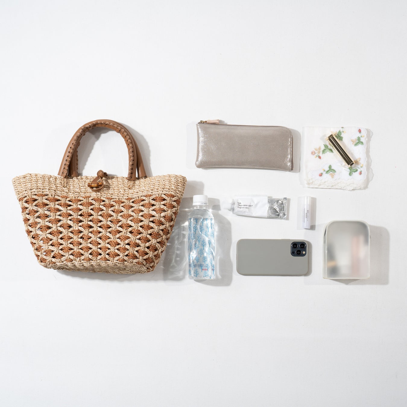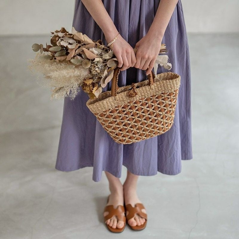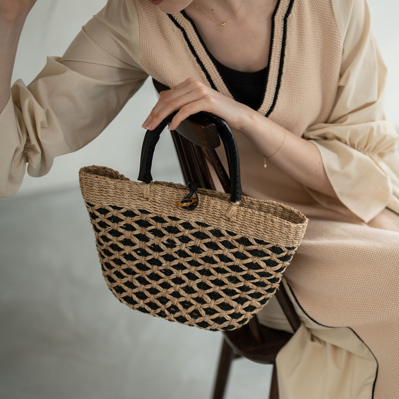絶妙に計算されたナチュラルカラーとブラック、ブラウンの組み合わせは、大人の女性が持つのにふさわしい上品さ。デザイン性も品質もどちらも叶えたかごバッグです。