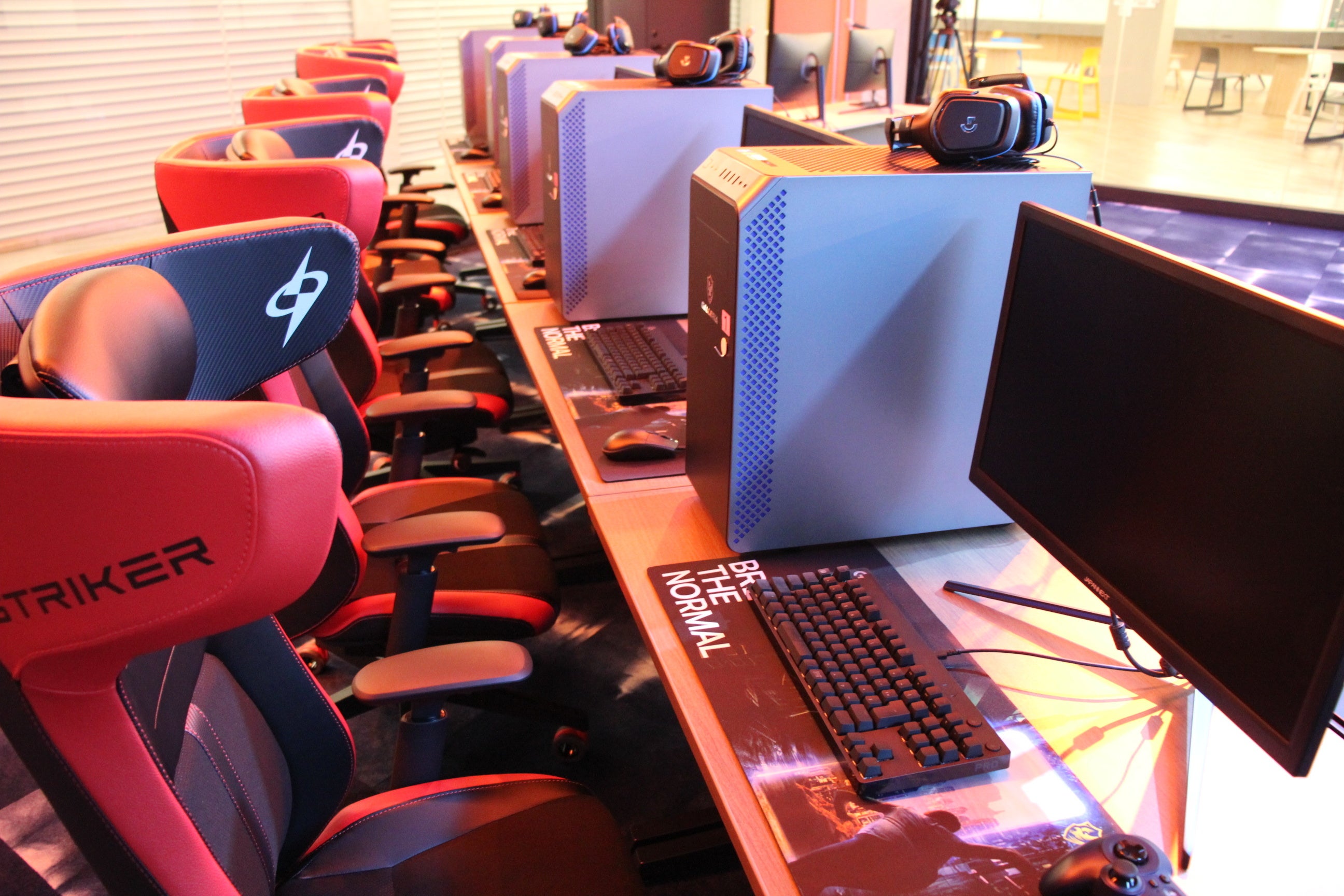 ゲーミングチェア10脚、デスク、大型モニター(75インチ)、配信用PC、ビデオスイッチャー、