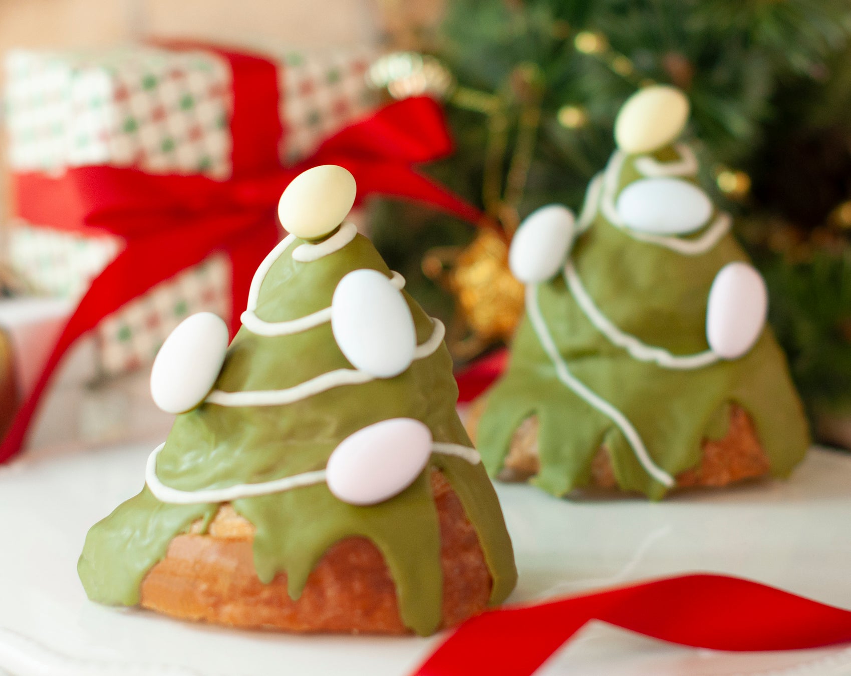 商品特徴:クロワッサンに抹茶チョコをかけてカラフルなアーモンドチョコを飾り付けた、かわいいサイズのクリスマスツリーパンです。