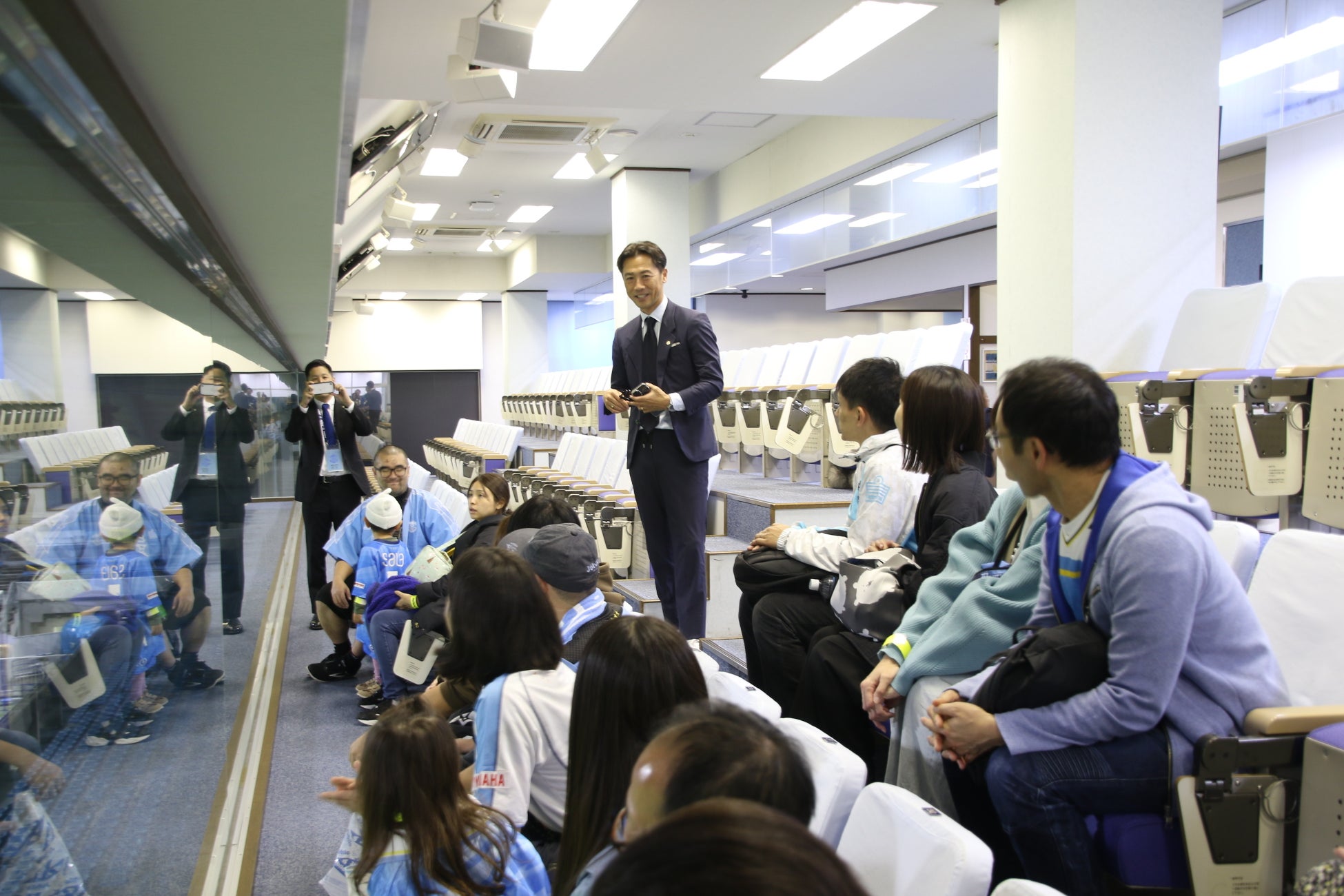 試合後に行われたヤマハスタジアム見学では、普段は入ることができないVIPルームを見学していると藤田俊哉スポーツダイレクターがサプライズ登場しました。クラブレジェンドから「ぜひ磐田にお越しください」とお声がけいただき、参加者からは歓声が上がりました。