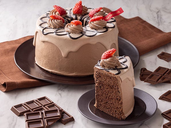 ふんわり・しっとりとしたココアシフォンに、たっぷりのチョコクリームでデコレーションしたシフォンケーキです。仕上げにかけたチョコレートソースがアクセント。