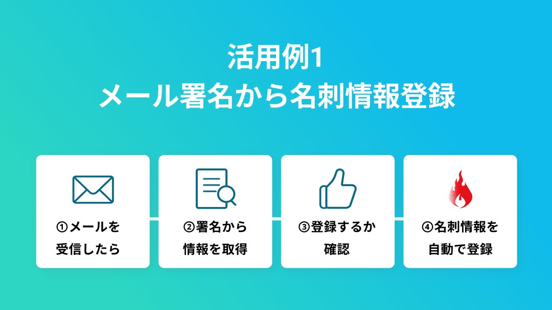 メールの署名情報をAIで抽出し、名刺登録するかを担当者が確認後にホットプロファイルに登録するフローです。オンラインでの商談が増えている中、名刺交換をしなくても手間なく顧客接点を一元管理いただけます。