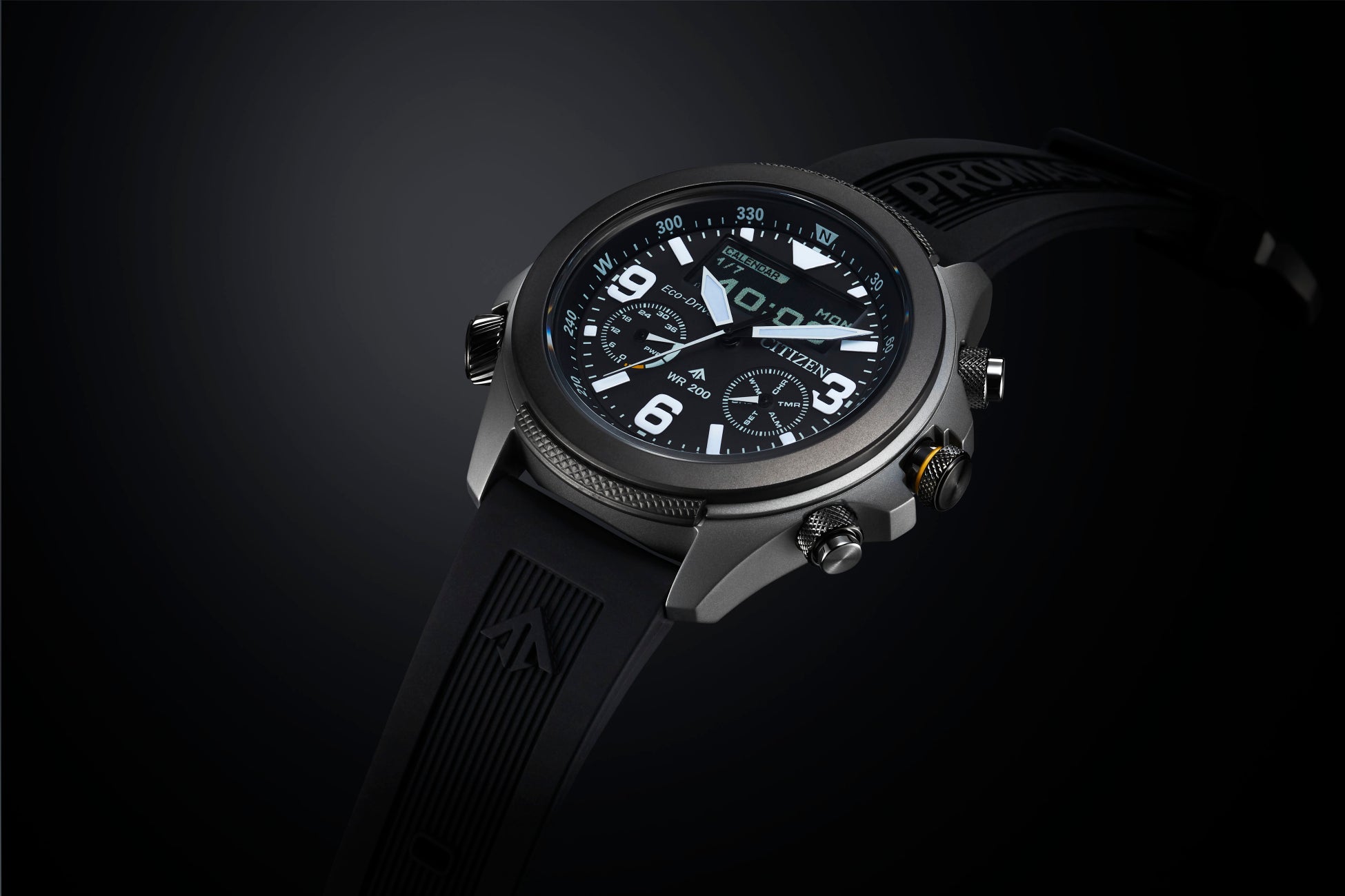 プロマスター(シチズン時計株式会社)は、過酷な環境にも耐えうる信頼性と陸・海・空各専門分野で要求される機能性を持つプロフェッショナルスポーツウオッチです。頑丈で、ハイエンドなアクティブ機能を備えるだけでなく、身体的にも、精神的にも自身の限界に挑む人達に「機能性」「耐久性」「安全性」という3つの特性を兼ね備えた商品を提案することで、「想像力」を掻き立て、未知の領域への憧れや夢の実現を応援します。
