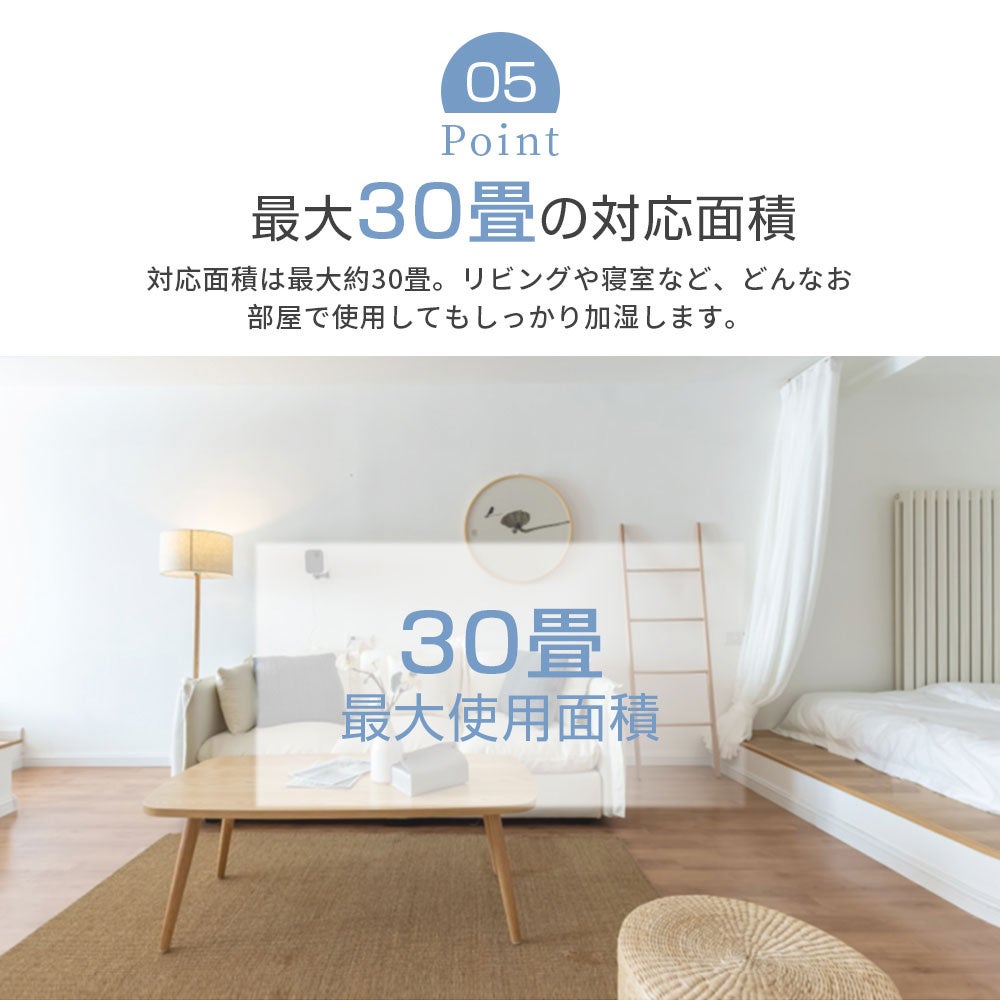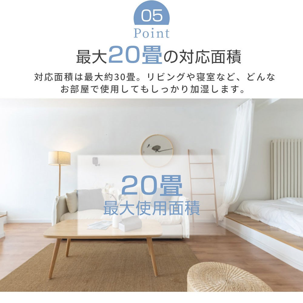 4L大容量で、水タンクを満タンにすれば、約11~35時間の連続使用が可能で、頻繁に給水する必要がなく、長時間加湿したい場合にもピッタリです。超音波式による優れた加湿能力を備えており、強モードの約250ml/hの加湿能力や360°自由回転の吹出口によって、20畳でより広い範囲にうるおいをお届けできて、効率よく湿度を保ちます。