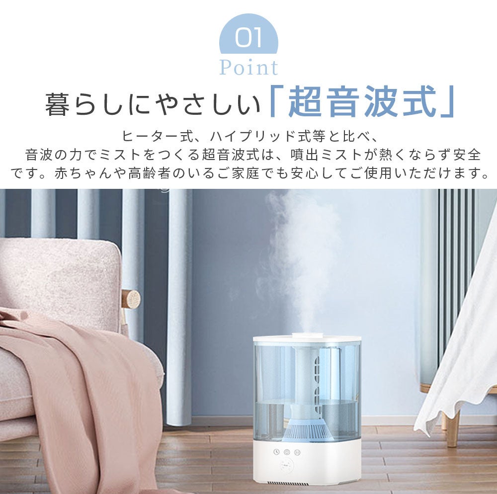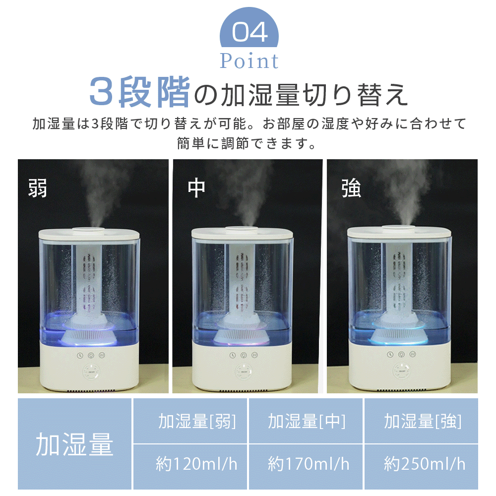 超音波式でミストが熱くならないので、子供やペットがいるご家族も安心して使えます。タッチ操作で、ミスト量は弱・中・強の3段階で調節可能で、部屋の大きさや季節などに応じて選択できます。
