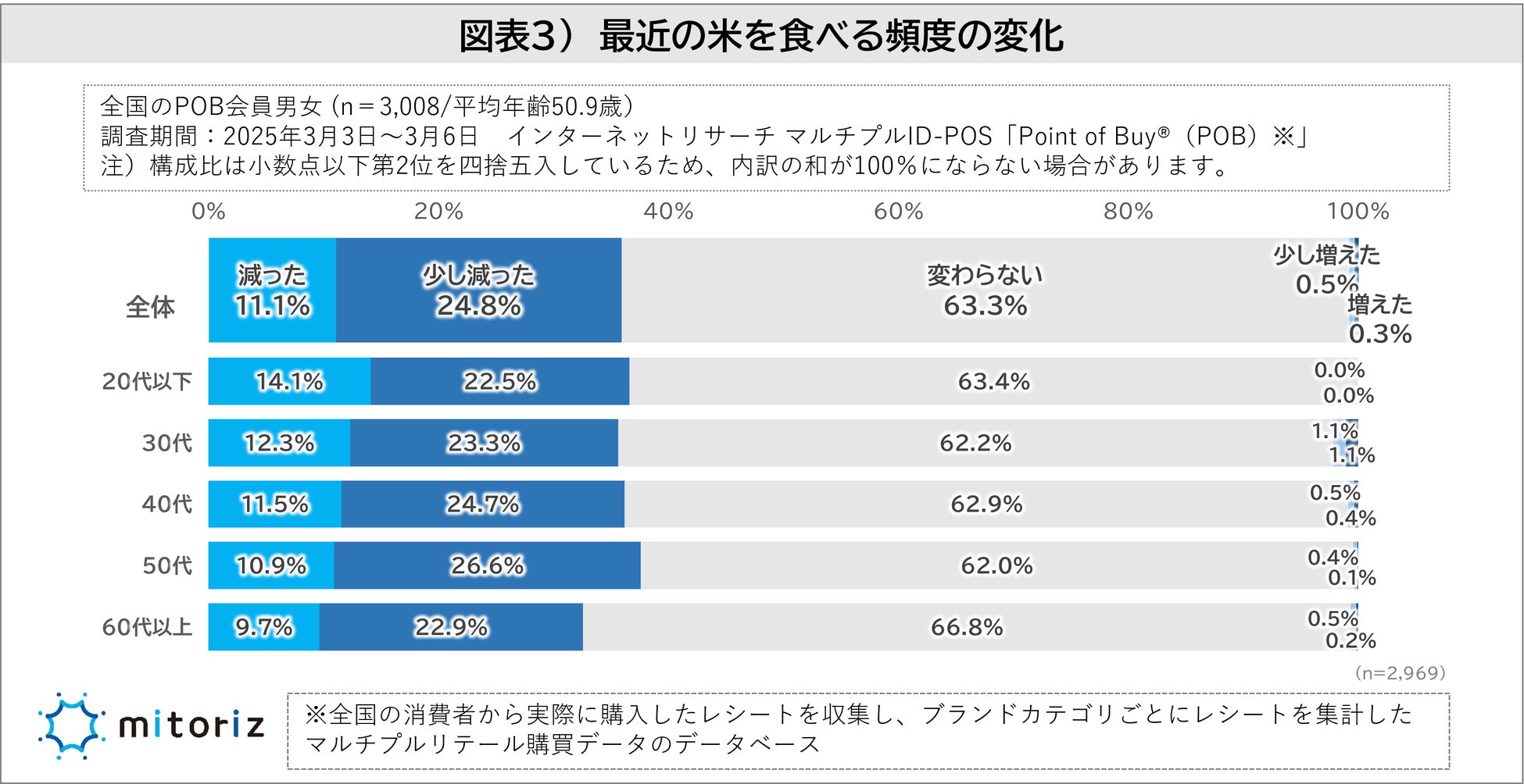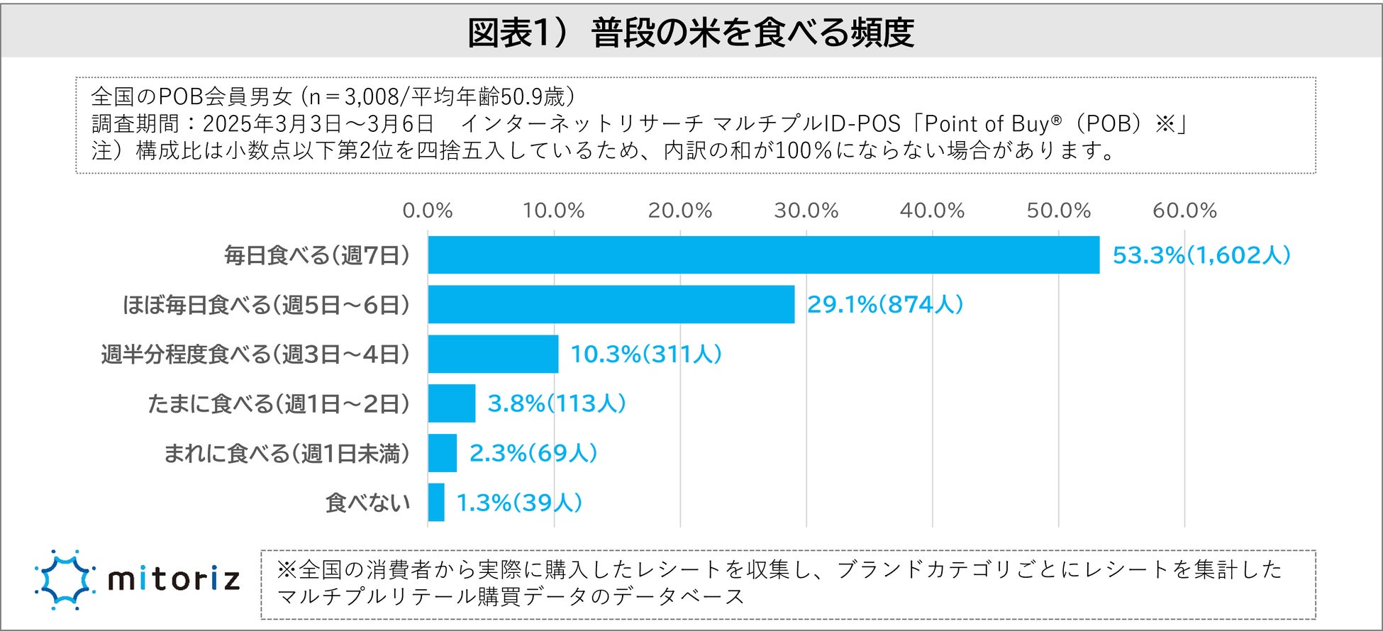 株式会社mitoriz(本社:東京都港区、代表取締役社長:木名瀬博)は、消費者購買行動データサービス「Point of Buy®(以下、POB)」の会員3,008人に「米に関する調査」を実施致しました。