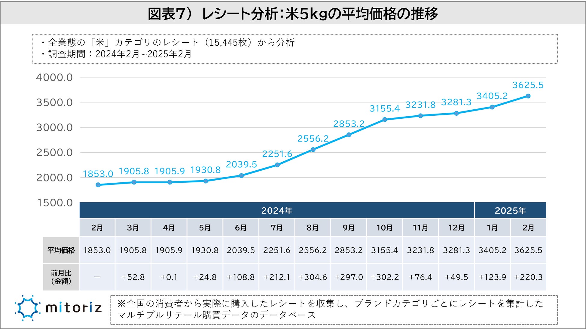 POB会員が投稿したレシートデータ(15,445枚)をもとに、「米5kgの平均価格推移」を分析した結果、2024年は6月までは2,000円前後で安定していましたが、7月には2,251.6円と前月比+212円と急上昇。その後も上昇が続き、8月から10月は毎月300円のペースで上昇し、10月には3,155.4円と3,000円台に突入しました。2025年に入っても上昇は続き、2025年2月には2024年2月の1,853.0円から3,625.5円(前年同月比+1,772.5円)へと、1年間でほぼ2倍に上昇しています(図表7)。