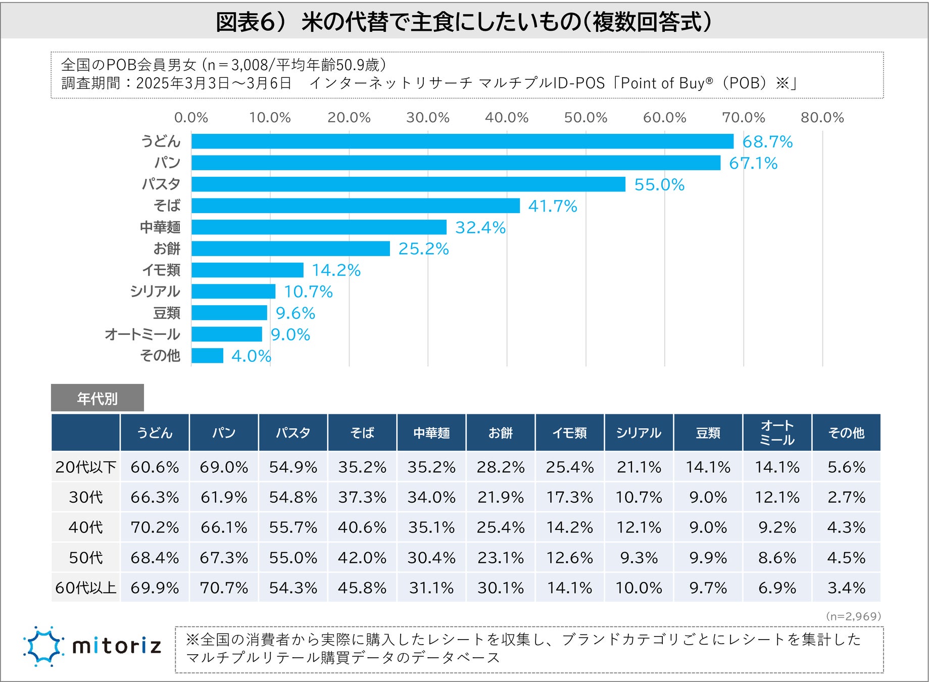 ・米の代替で主食にしたい食品、最多は「うどん」で68.7%、次いで「パン」が67.1%
