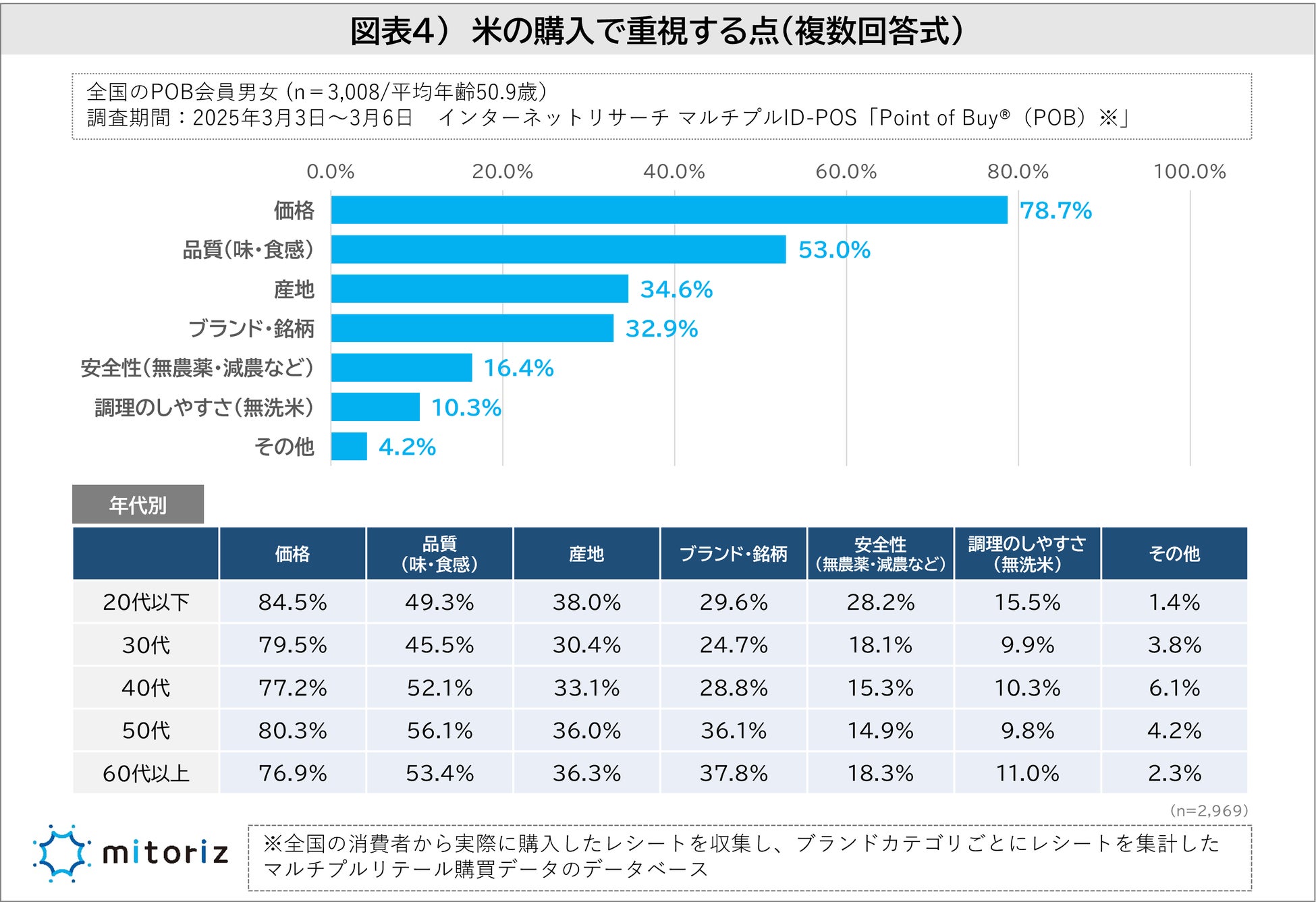 ・米の購入時に重視する点は「価格」が78.7%で最多、「ブランド・銘柄」は上の年代ほど意識