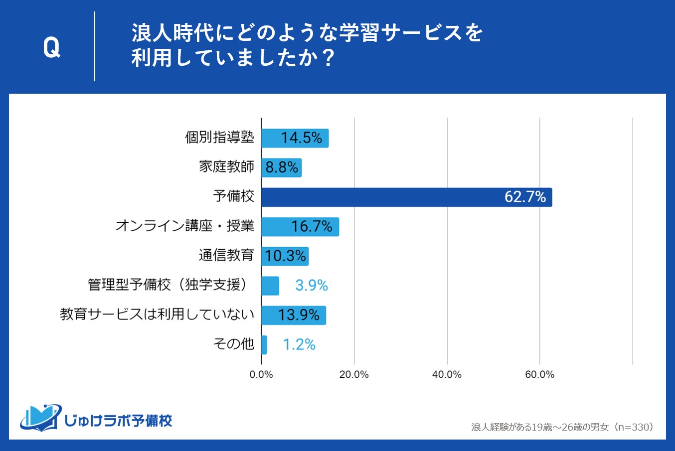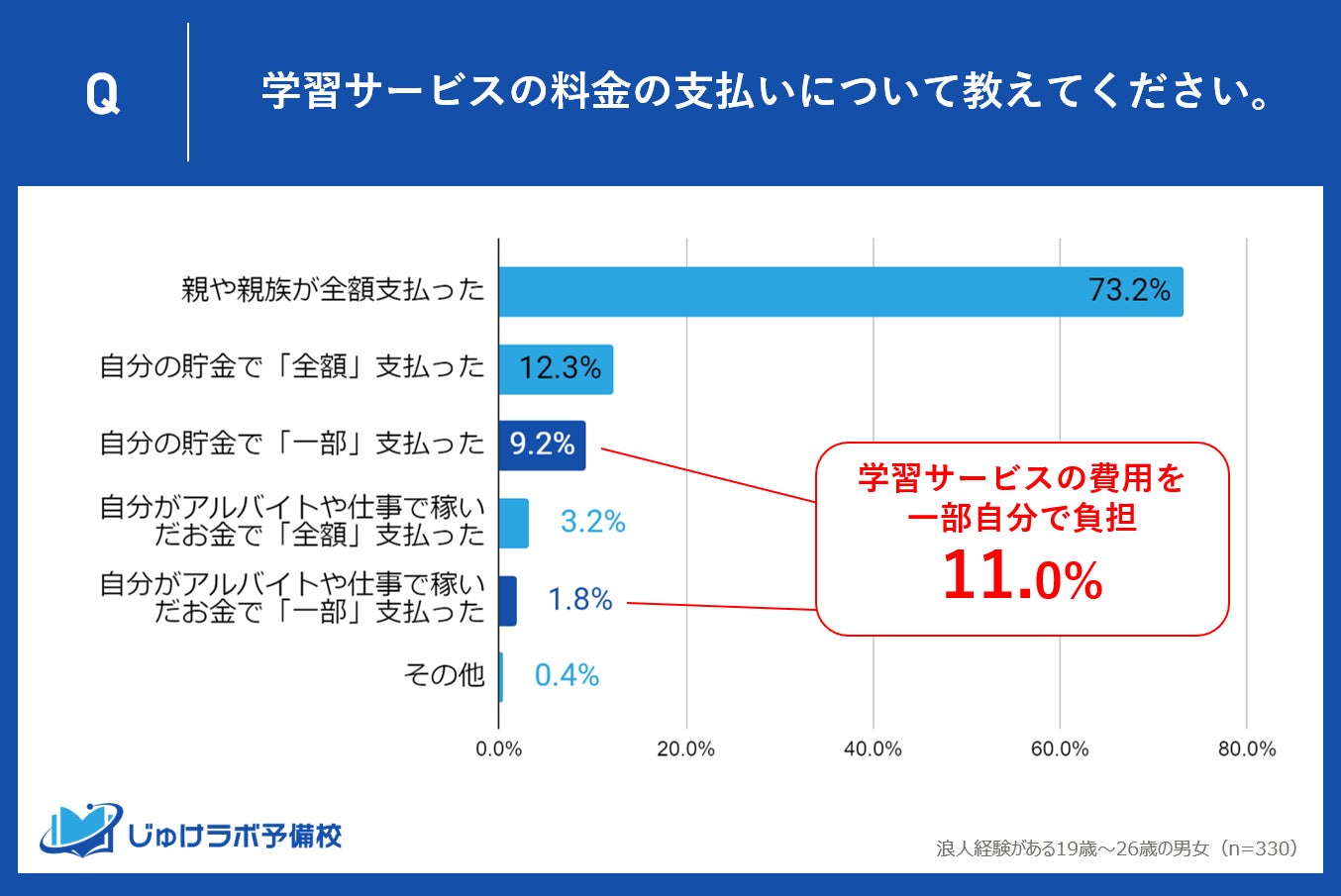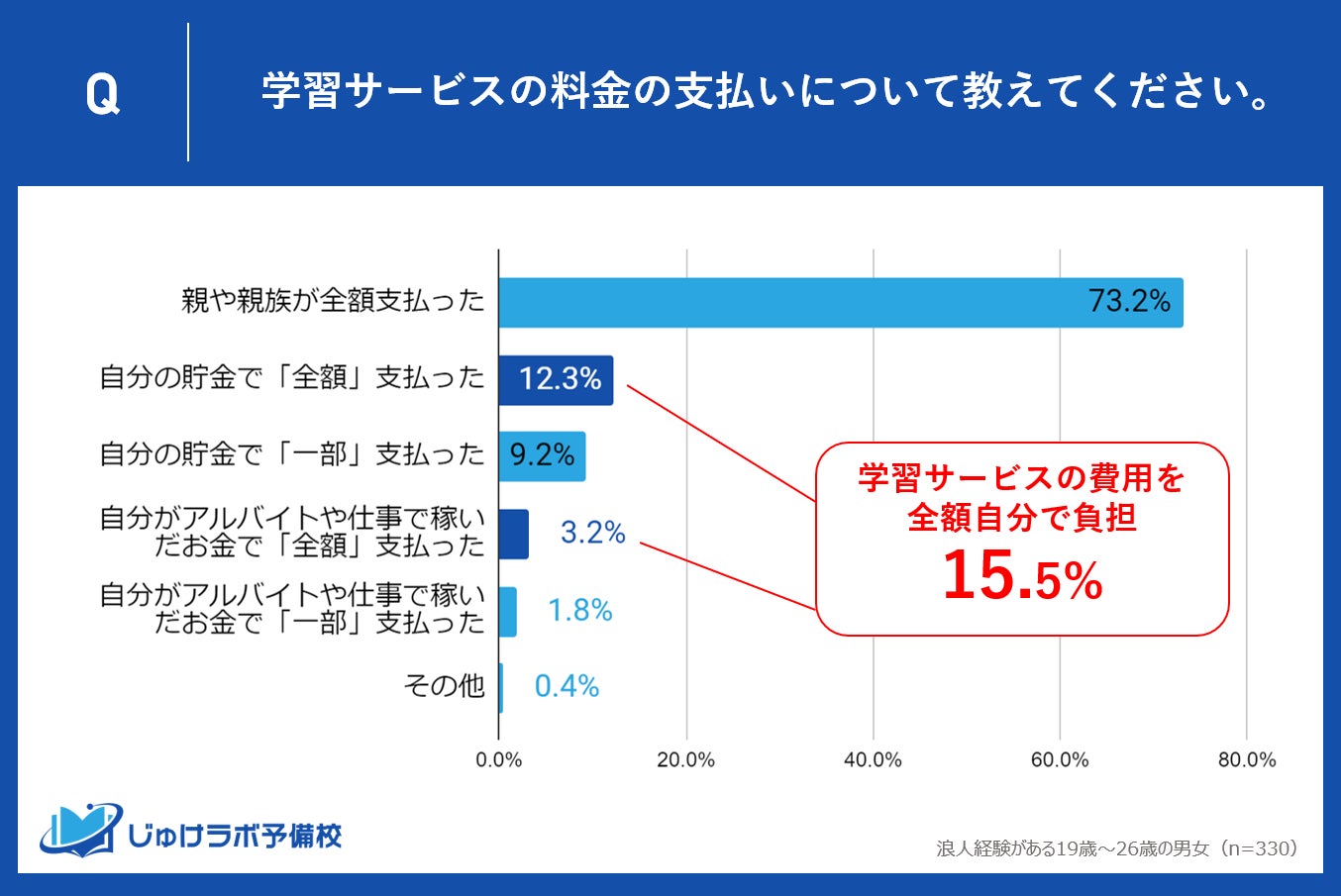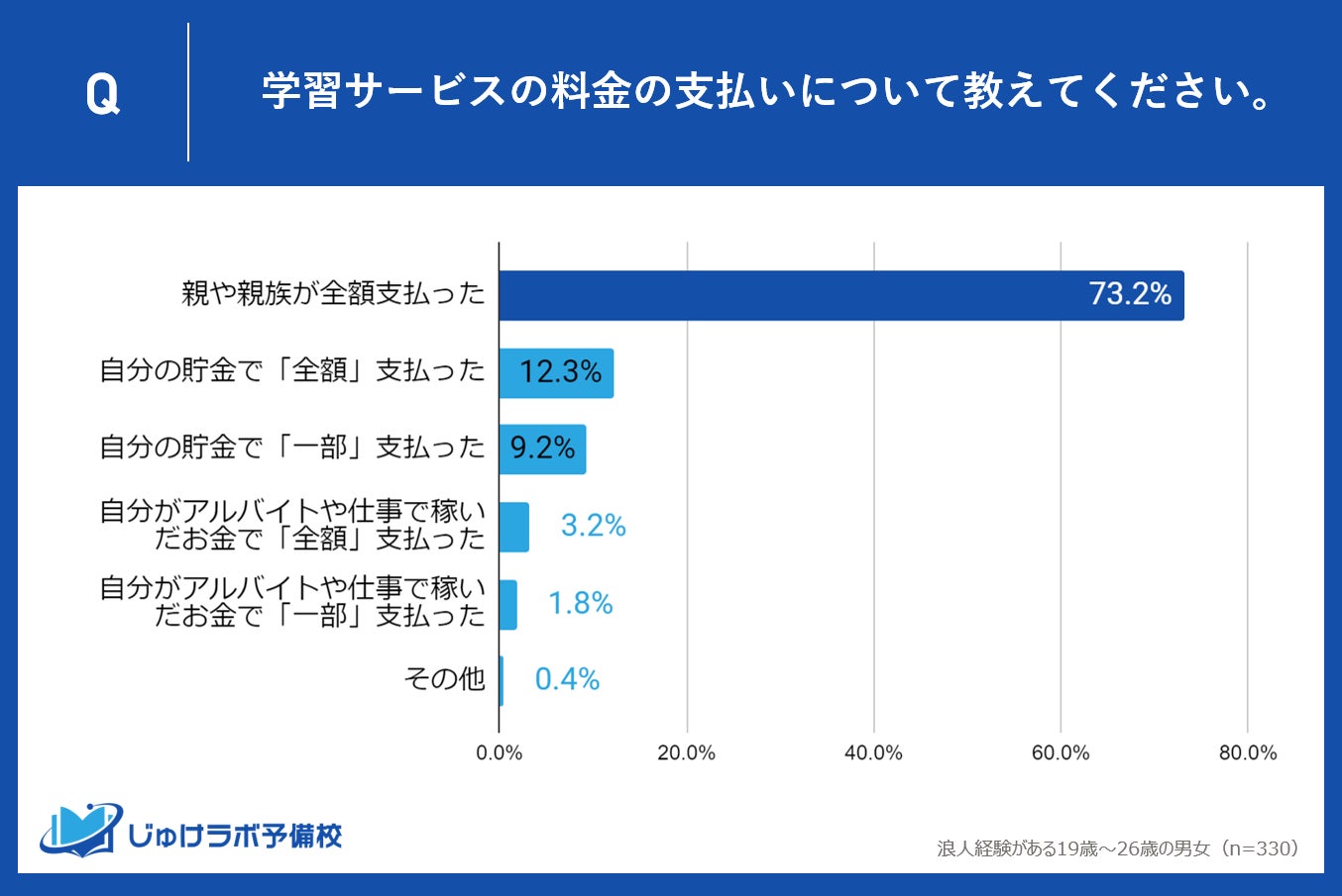 じゅけラボ予備校(所在地:大阪市北区、代表取締役:後藤智則)は、浪人経験がある19歳〜26歳の男女330人を対象に、教育サービスと費用負担に関する実態調査を実施しました。