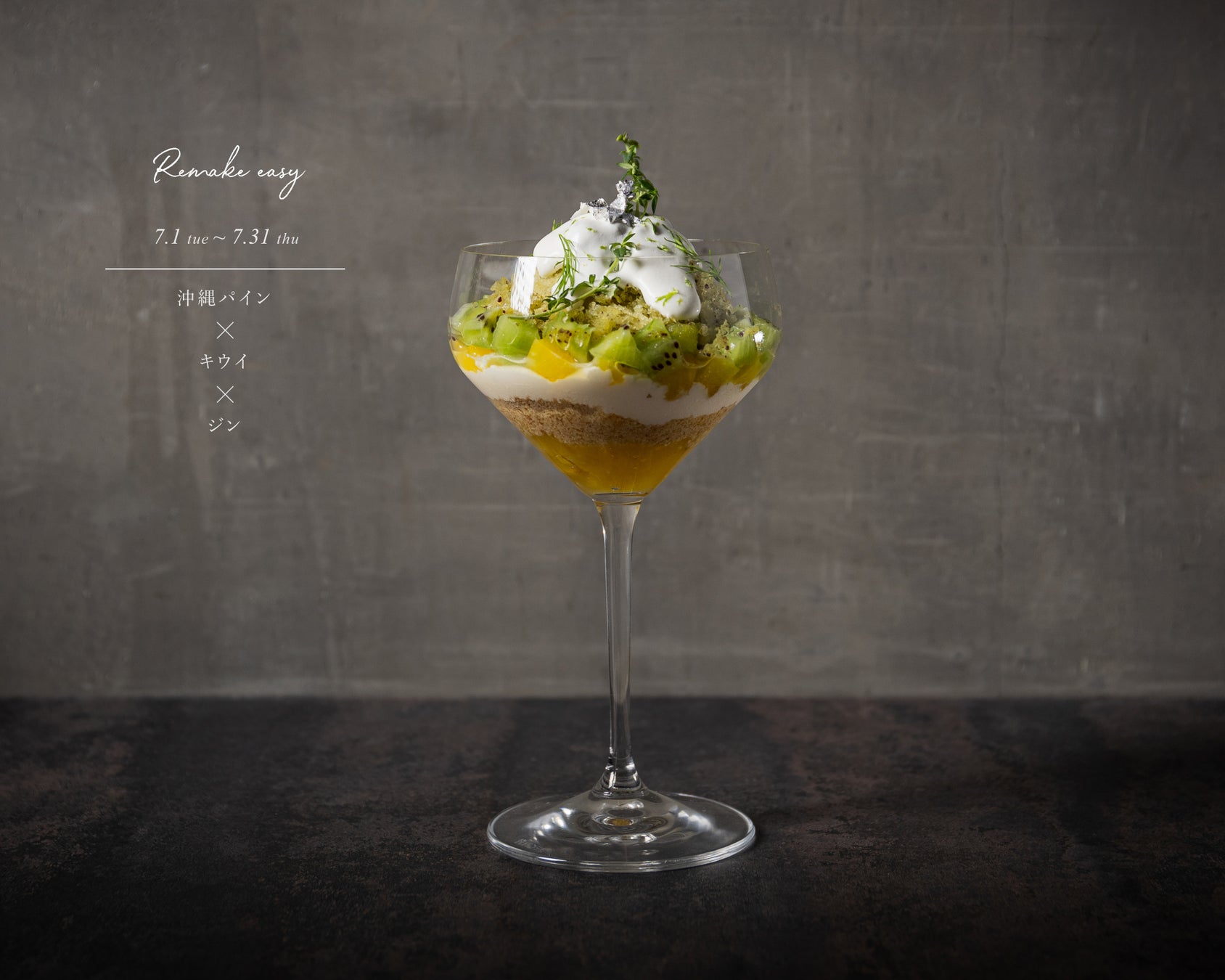 完全会員制パフェバー「Remake easy」、沖縄産パイナップルをふんだんに使った『沖縄パインとキウイのハーバルグラニテパフェ』が7月限定で登場。爽やかで香り豊かな初夏だけの特別なパフェを堪能。