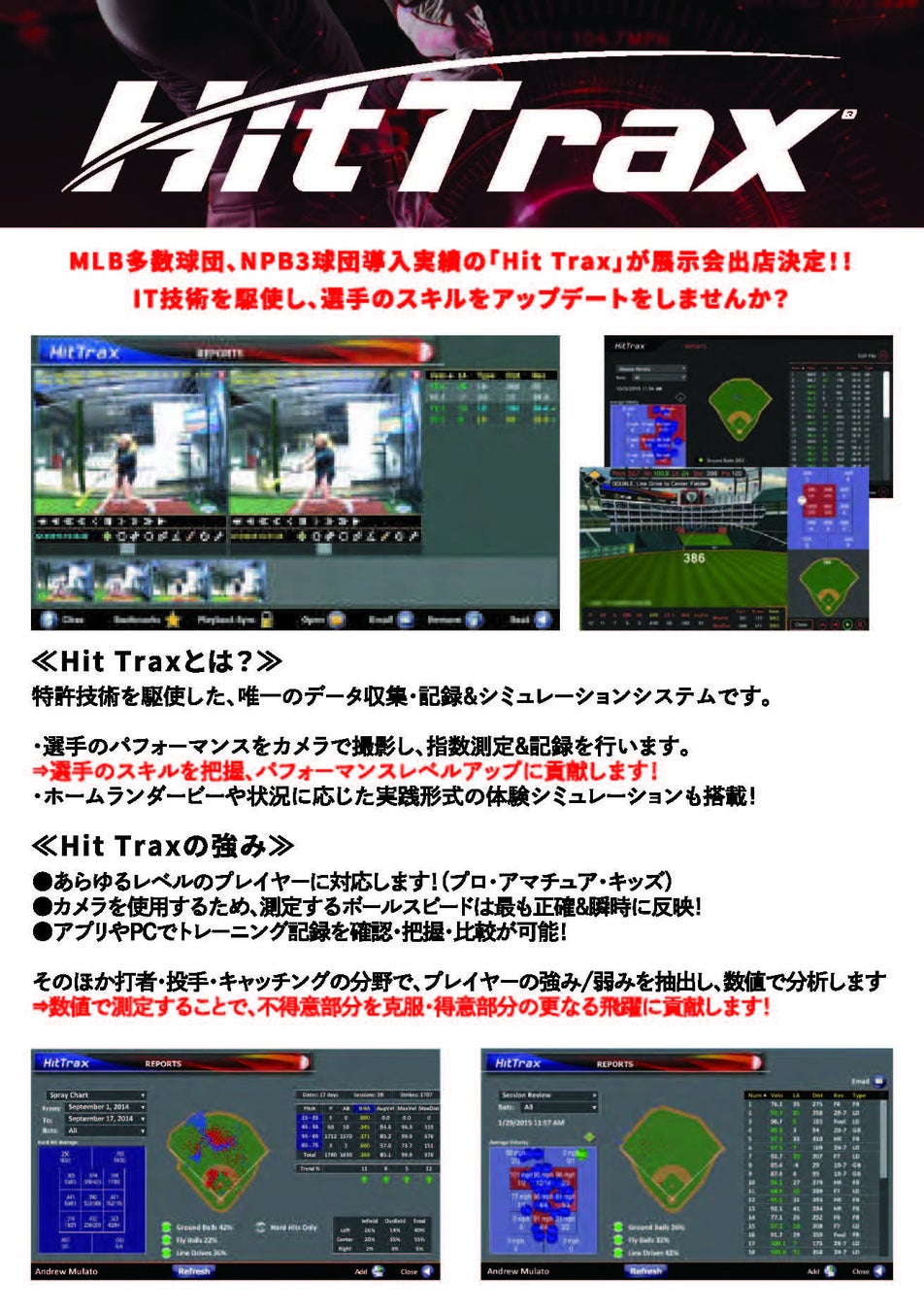 米国製の野球・ソフトボールトレーニングシステム。トレーニングデータの測定・分析により、プロからアマチュアまで幅広い層が利用可能です。日本でもプロ球団やバッティングセンターで導入が進んでいます。当社はこれを通じて、野球の技能向上と普及に貢献します。