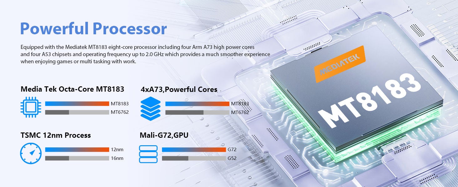 メディアテックに開発されたオクタコアプロセッサ「MT8183」は低消費電力の12nmプロセスで製造され、Mali-G72グラフィックスプロセッサを合わせ、最大2.0GHzのA73アーキテクチャのハイパフォーマンスコアを4基搭載していて、大規模なプログラムと高負荷なスマホゲームをより快適に楽しめるようになった。