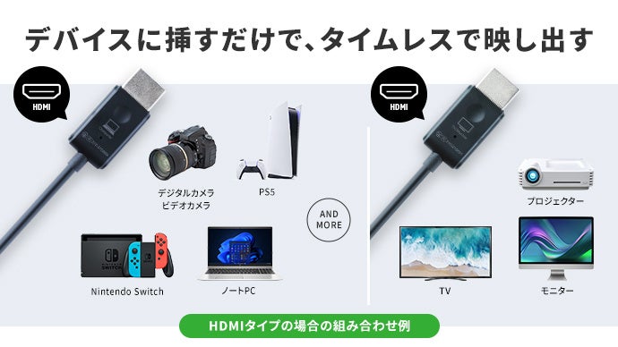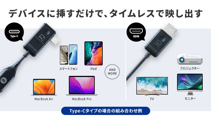 また、「ミラリン」はTypeCポートまたはHDMIポートに対応する2種類の機種があります。映像の送信側の機器の接続端子に応じて、お好みの機種をお選びいただけます。