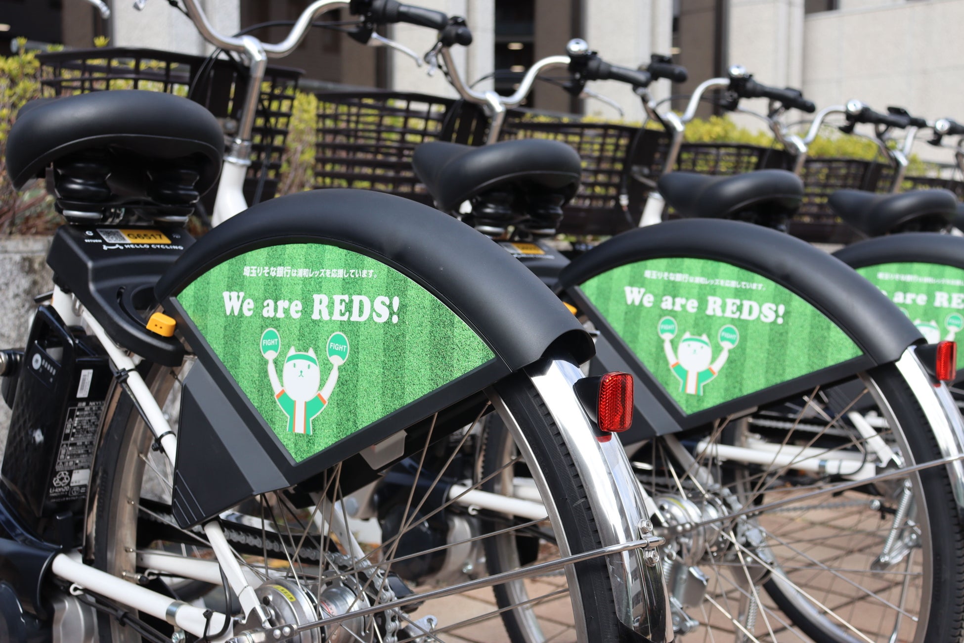 この度、「HELLO CYCLING」の事業パートナーとして浦和レッズが参画し、オリジナル自転車「レッズサイクル」を導入することになりました。開始当初は、さいたま市内の既存ステーションに200台設置します。「レッズサイクル」のドレスガードは、浦和レッズデザインの他、浦和レッズのオフィシャルパートナーの株式会社ビタブリッドジャパン、ファミリーパートナーの株式会社埼玉りそな銀行とのコラボデザインとなっています。各デザイン1台限定で選手サイン入りのドレスガードが付いているので、ぜひ街中でレッズサイクルを探してみてください。