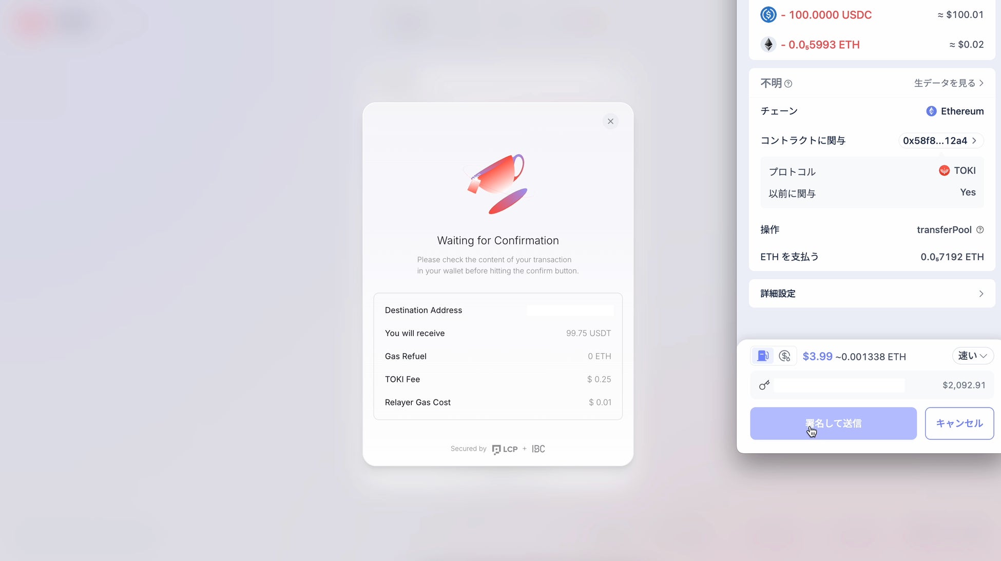 5 表示されるブリッジの手数料などを確認し、ウォレットでトランザクションを承認・実行します。