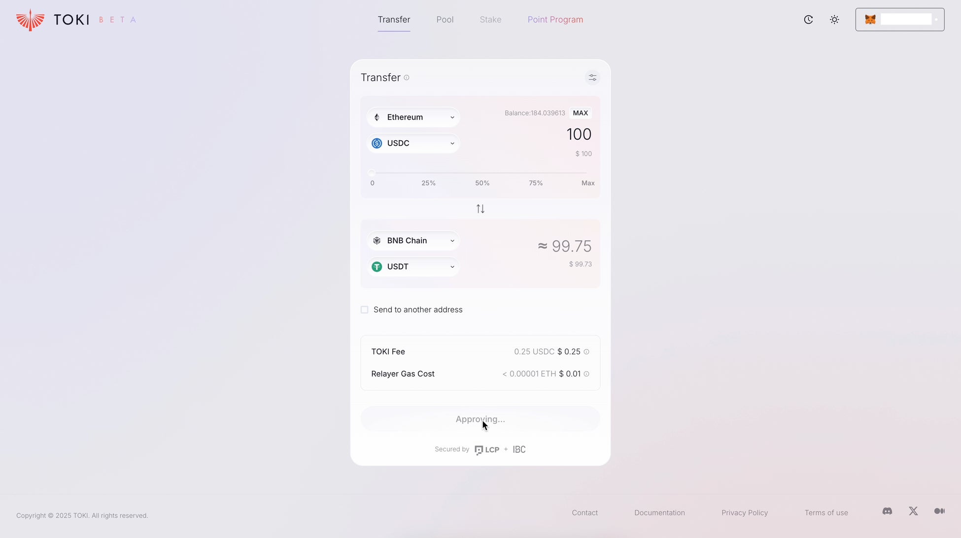 1 TOKIの公式ウェブサイト(https://toki.finance/)にアクセスし、Transfer Nowをクリック。