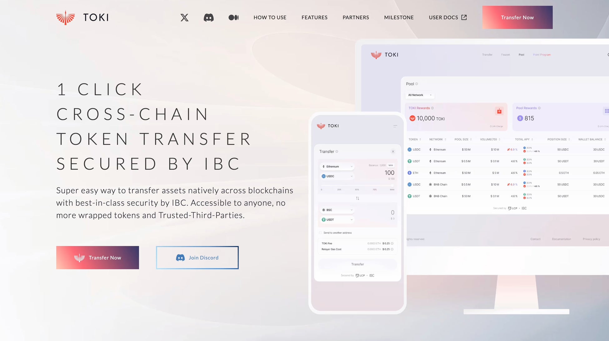 TOKIは、異なるブロックチェーン間での資産移動をシームレスかつ安全に行うことを可能にするクロスチェーンブリッジです。現在の暗号資産エコシステムでは、複数のブロックチェーンが乱立しており、それぞれのチェーン間で資産を移動する際に多くの課題が存在します。TOKIはこれらの課題を解決し、ユーザーがより自由に、そして安心してブロックチェーンエコシステムを横断できるよう設計されています。Datachainは、TOKIが採用するIBC(Inter-Blockchain Communication)プロトコルに基づく安全で堅牢なブリッジ機能の実現に貢献しており、これによりTOKIはブロックチェーン間の相互運用性(インターオペラビリティ)技術を活用したプロダクトを提供しています。