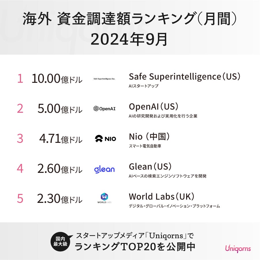 国内最大級のスタートアップメディア「Uniqorns(ユニコーンズ)」が2024年9月の海外スタートアップ資金調達状況をランキング形式で発表
