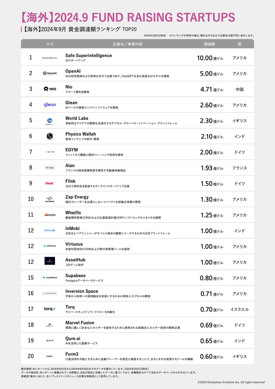 海外スタートアップ資金調達額ランキングトップ20企業(2024年9月)
