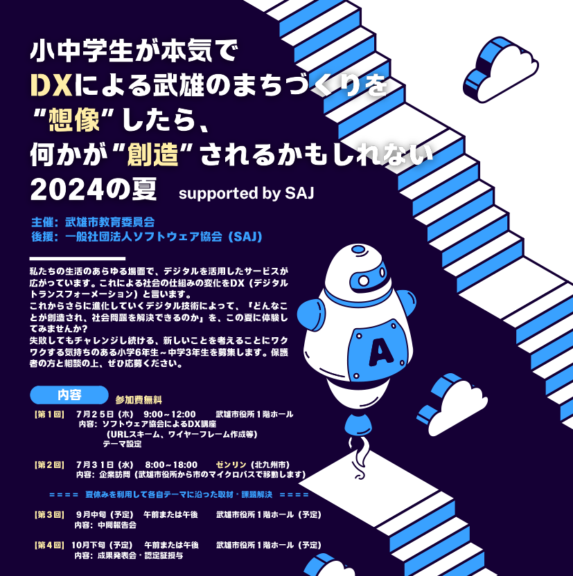 佐賀県武雄市が行っている武雄市ジュニアDXイノベーター育成事業の一環で行われるプログラムです。これからの社会で必要とされる情報技術やデジタルリテラシーがさらに高度化、複雑化していくなか、この激しい変化を前向きにとらえ、変化に柔軟に対応することができる児童・生徒の育成を目的としています。受講生が講座・ワークショップやICT技術を活用する企業訪問等など全4回のプログラムに参加し、社会課題の解決に向け探求活動を行うことで、主体性や論理的思考力、問題解決力など21世紀型スキルを育み、それぞれが所属する学校においてもリーダーシップを発揮しながら、身に着けたスキルやリテラシーを拡散することで、学校現場における教育DXが推進されることを目指しています。
