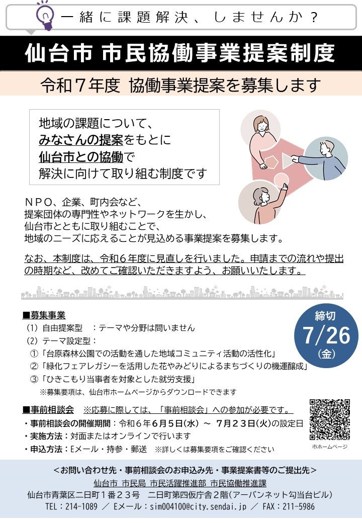 仙台市HP:https://www.city.sendai.jp/kyodosuishin/kurashi/manabu/npo/shimin/oshirase/r7teianbosyu.html
