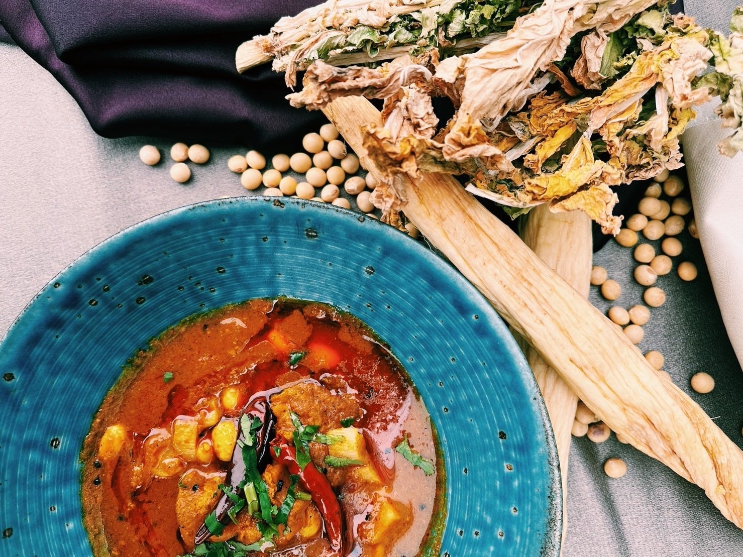たっぷりの太陽を浴びて凝縮された香りと発酵の酸味を感じる干し大根に、コクのある大豆の甘みをスパイスが引き立てる、日本のひなた宮崎県の豊かな恵みが凝縮された一品です。