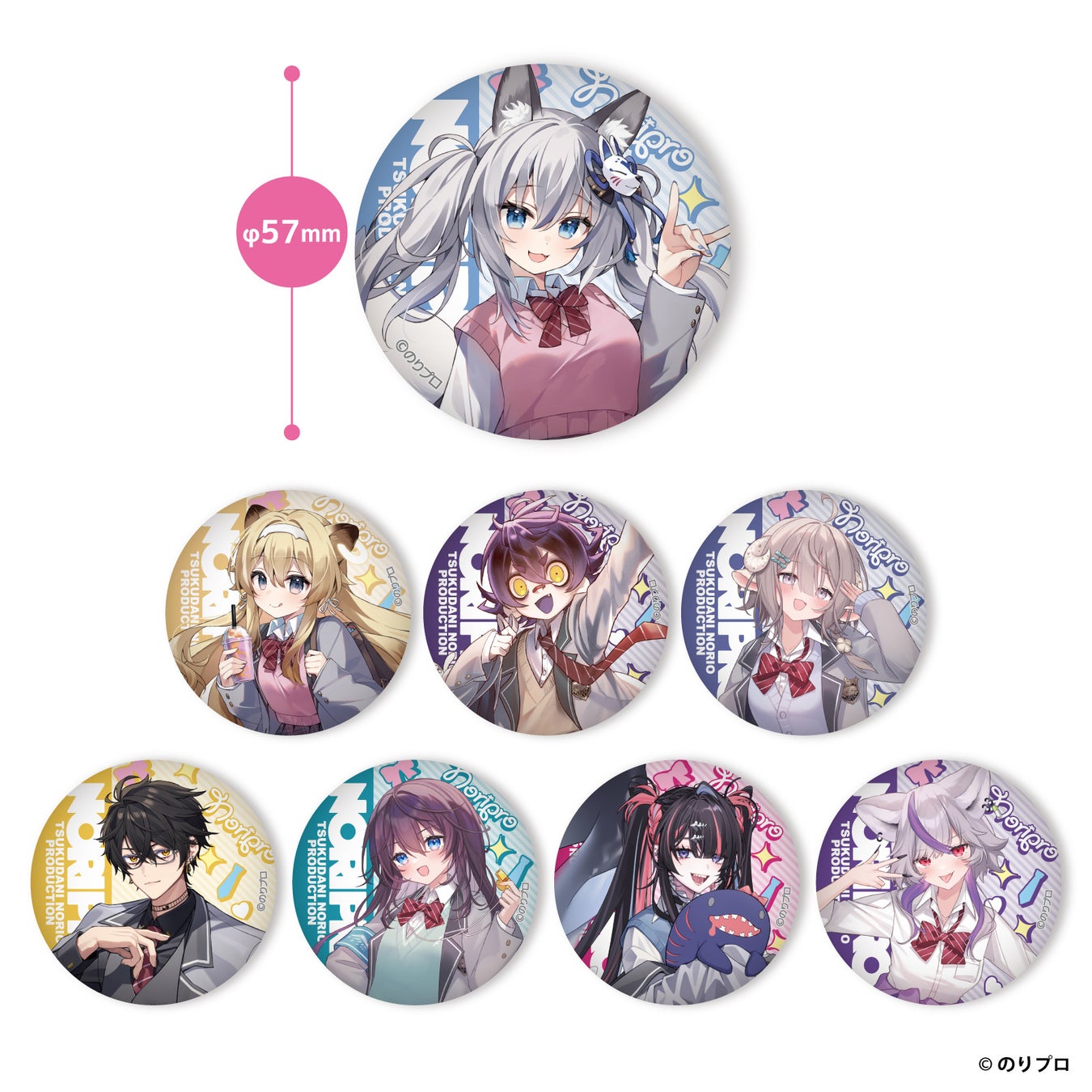 のりプロ所属の稲荷いろは、レグルシュ・ライオンハート、瀬兎一也、斎木こまり、梟雄しろや、鷲羽アスカ、冥海らぶか、深狼れんげが缶バッジになってプライズ登場!カバンや小物につけたり、並べて飾ったりキャラクターとの日常をお楽しみください。