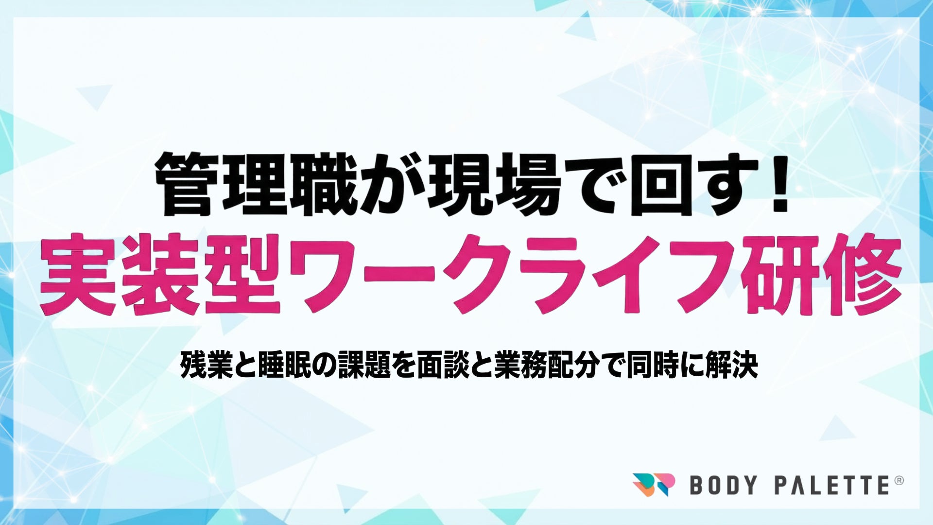 本研修は、残業・睡眠・生産性を同時に扱い、管理職の面談・業務配分まで含めて現場に実装するワークライフバランス研修です。