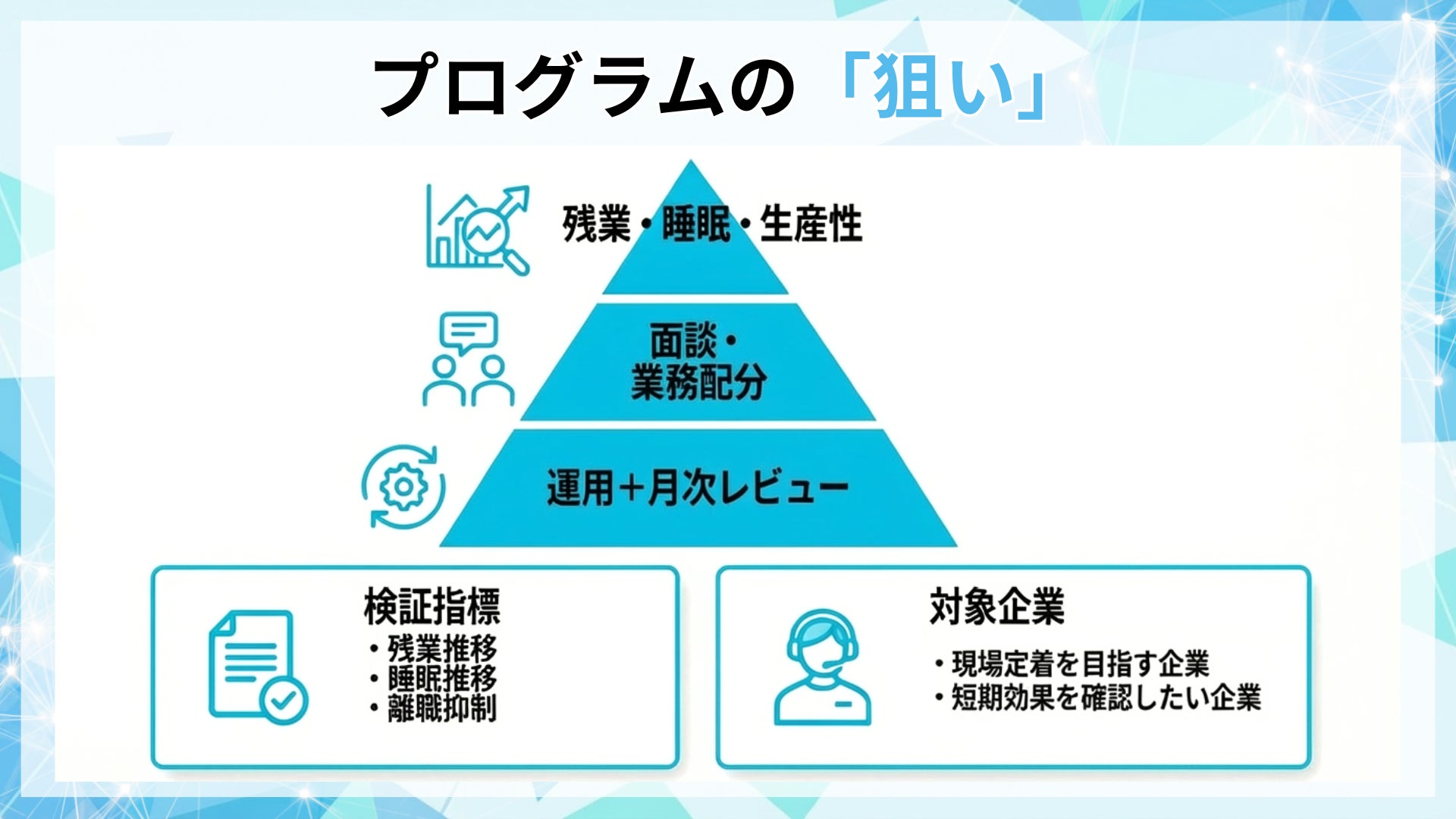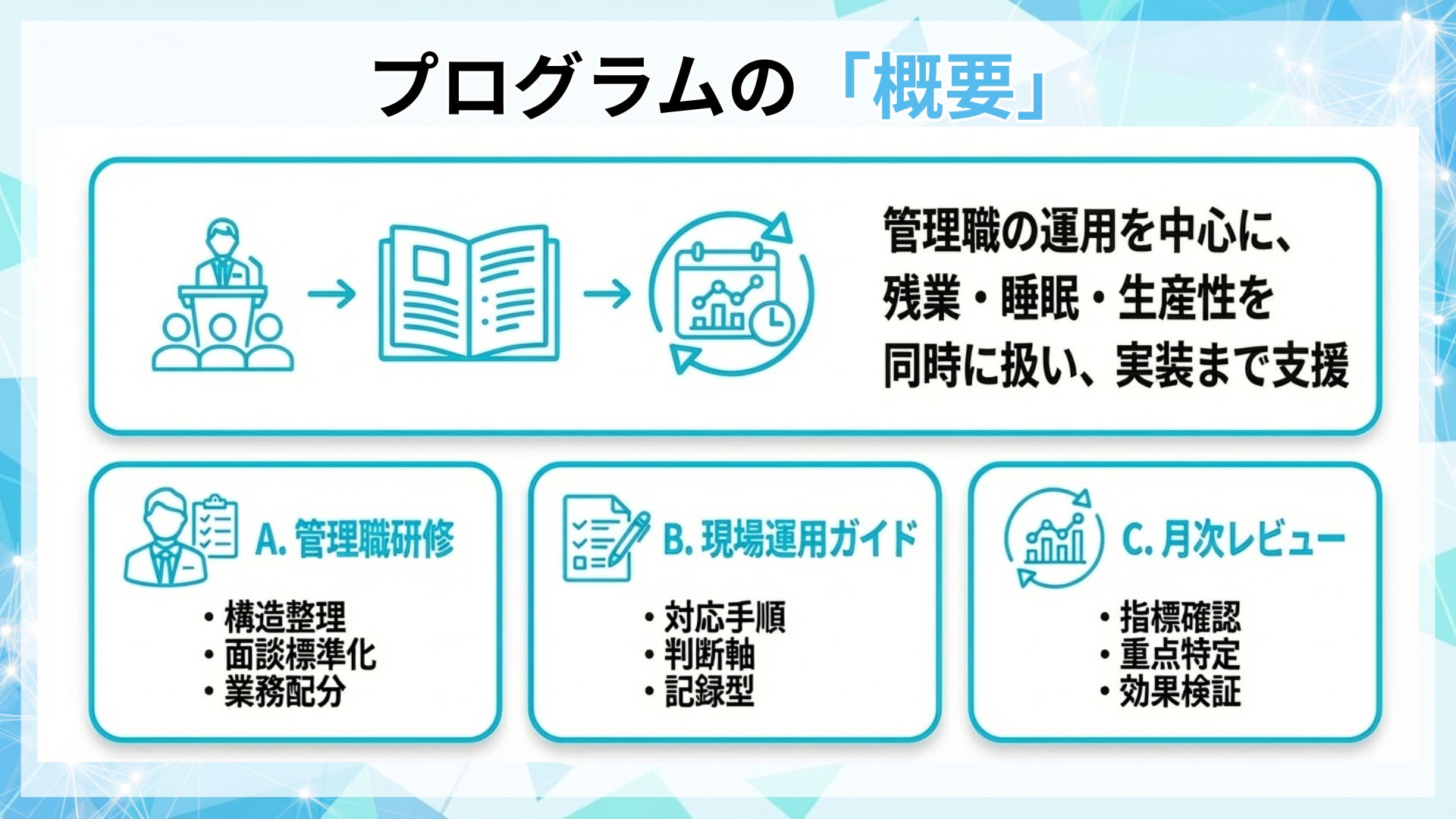 本研修は、管理職の運用を中心に、残業・睡眠・生産性の論点を同時に扱い、実装までを支援するプログラムです。
