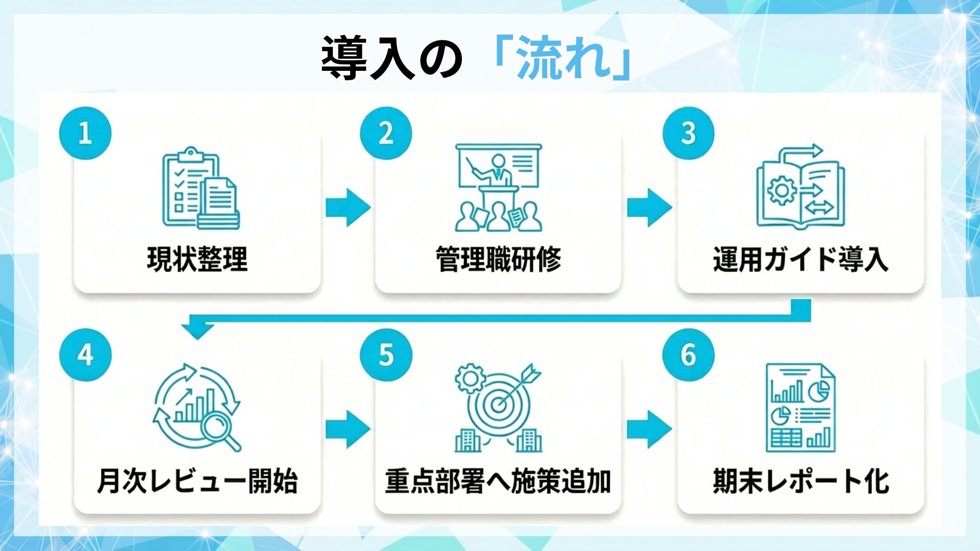研修で終わらせず、運用ガイドと月次レビューで改善を継続し、短期で追える指標(残業時間、睡眠自己申告、離職兆候)で効果を検証します。