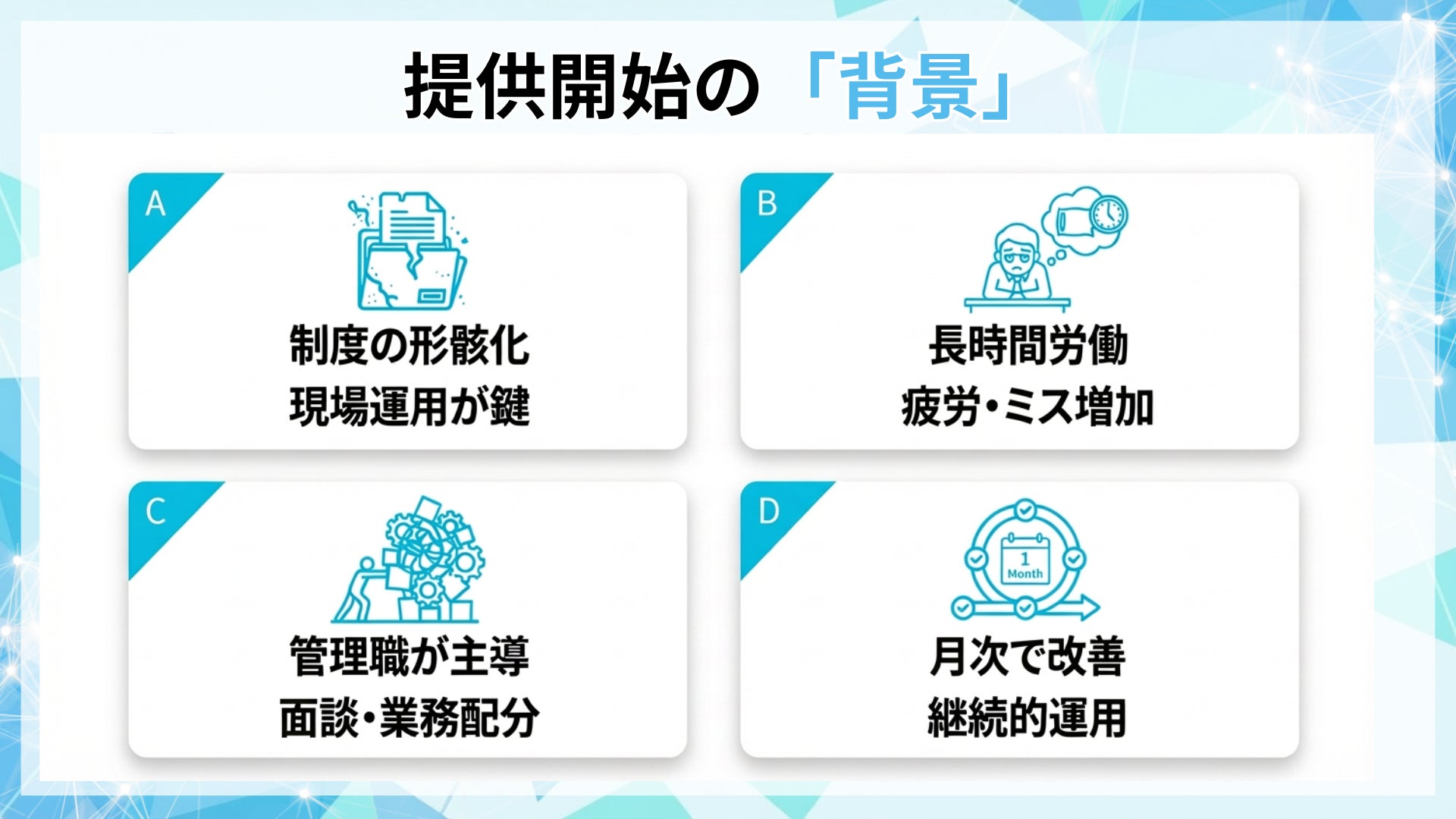 本研修は、残業削減を「個人の努力」に委ねず、管理職の面談・業務配分を運用として整備し、月次で回す仕組みを提供します。