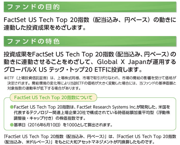 FactSet US Tech Top 20指数(配当込み、円ベース)の動きに連動した投資成果をめざします。