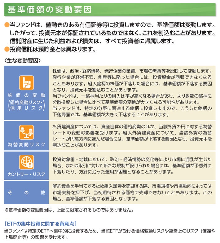 投資信託は値動きのある有価証券等に投資しますので、基準価額は大きく変動します。したがって、投資元本が保証されているものではありません。信託財産に生じた利益および損失はすべて投資者に帰属します。投資信託は預貯金とは異なります。