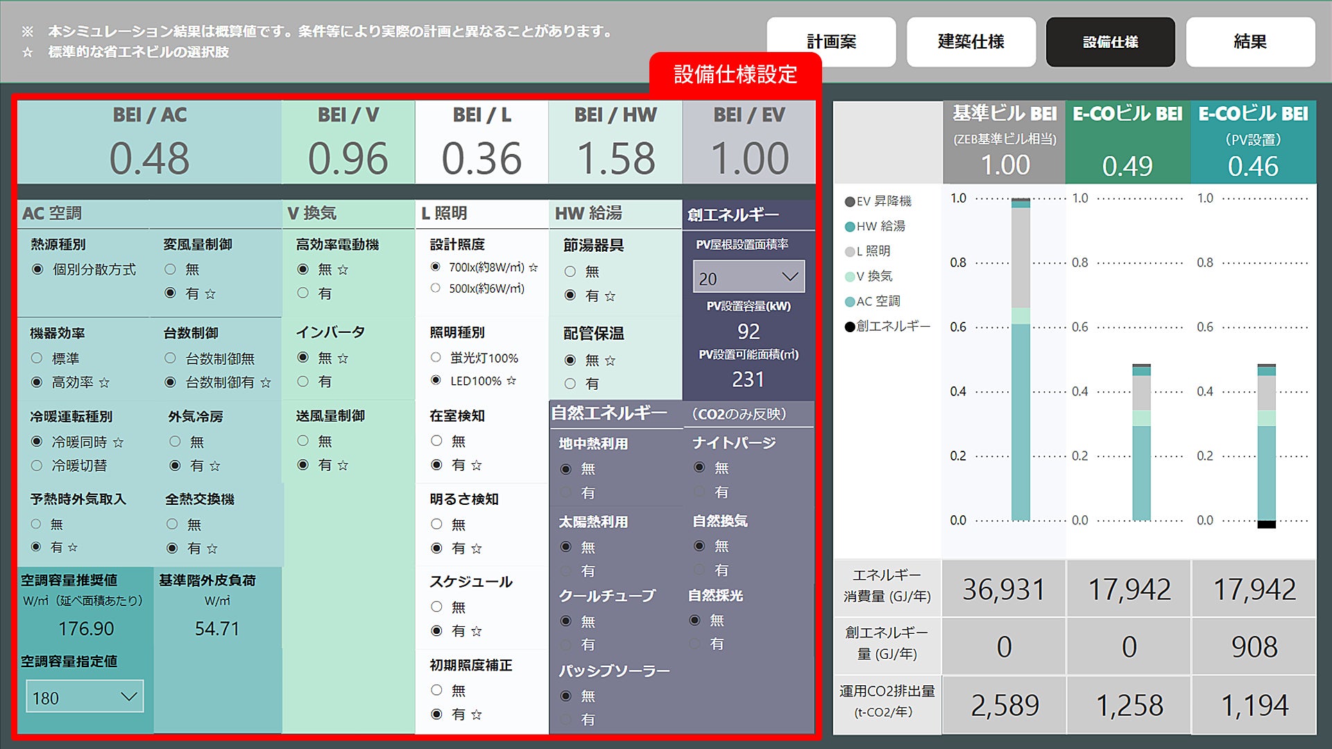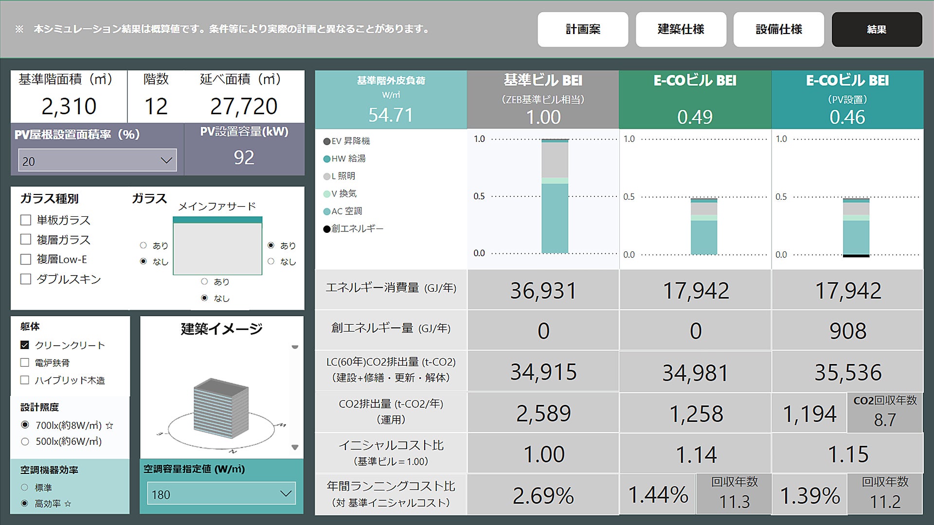 シミュレーション結果は、建設時と建築物運用時のCO2排出量の削減効果、建設時のコスト、運用時の年間コスト、BEI値(※1)として表示されます。各種の仕様の設定を変更すると、瞬時にそのシミュレーション結果が算出され、さまざまなパターンでの検討が可能になることで、お客様の事業計画に基づいた迅速な方針決定を支援します。