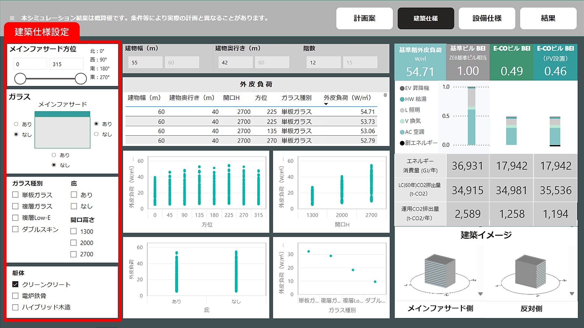 建築仕様は、メインファサード方向、ガラス種別、庇の有無、躯体の仕様を設定できます。躯体の仕様は、当社開発技術の低炭素型のコンクリート「クリーンクリート®」やハイブリッド木造といった低炭素型資材の設定も可能です。