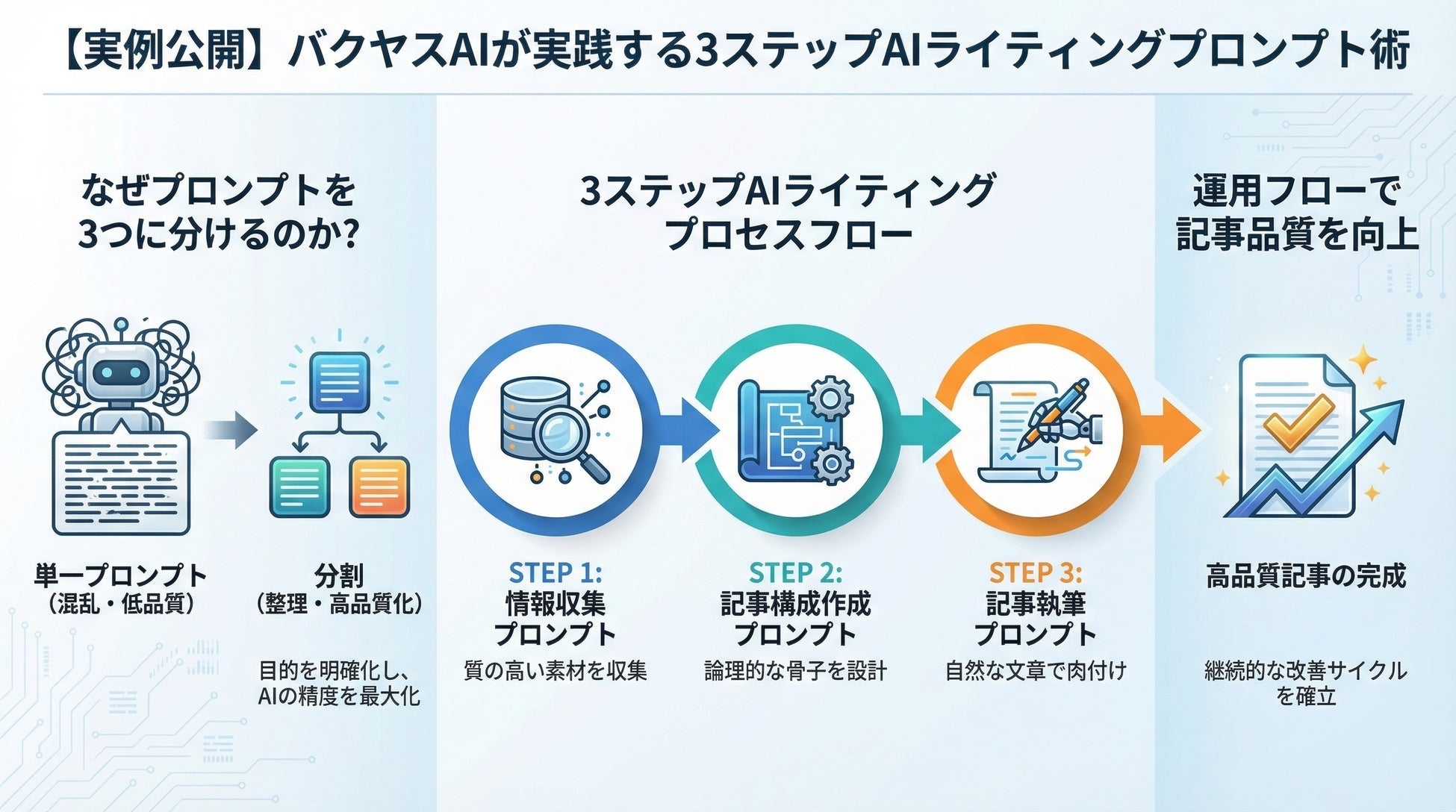 「バクヤスAI 記事代行」には、下記の3つの特徴がございます。