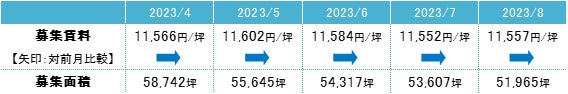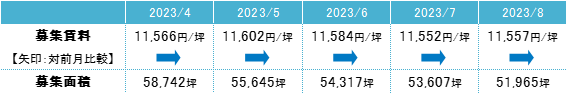 募集賃料は前月比プラス5円/坪の11,557円/坪となった。前月からほぼ横ばいで、募集賃料は11,000円/坪台半ばで推移している。