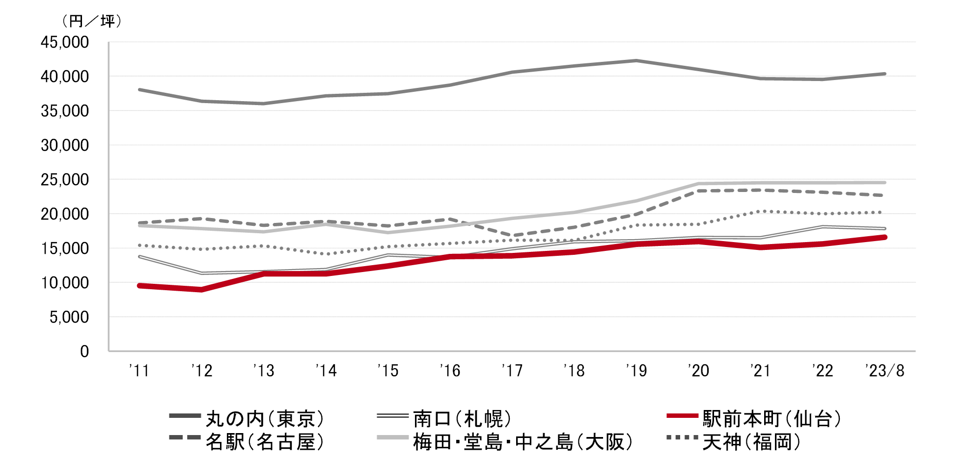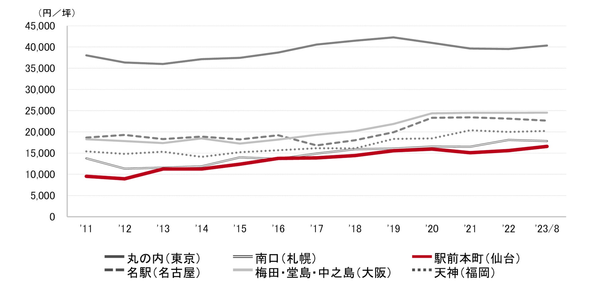 <募集賃料の推移(6大都市 大規模ビル・主要駅前地区)>