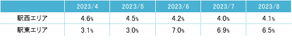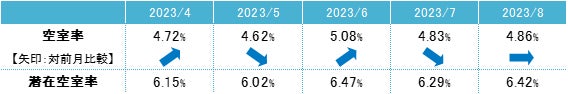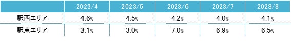 空室率は前月比プラス0.03ポイントの4.86%となり、前月からほぼ横ばいだった。8月に竣工した新築ビルがまとまった面積の空室を抱えて竣工した一方、統合や拡張移転等で成約し、わずかな動きに止まっている。規模別では「中型」が前月比プラス0.8ポイントと大幅に上昇した。潜在空室率は前月比プラス0.13ポイントの6.42%だった。拡張移転や新規開設等の前向きな需要に加え、建替えに伴う移転需要もあり、主要エリアでは既存ビルの募集床が品薄な状況となっている。