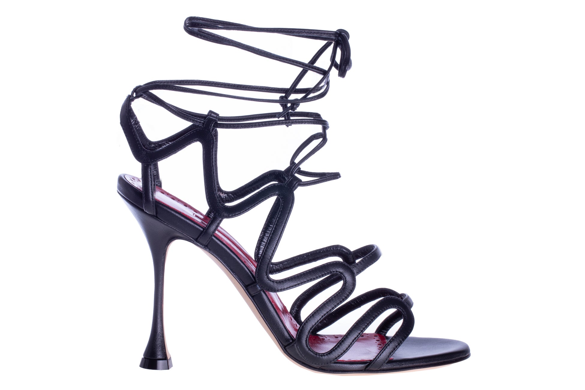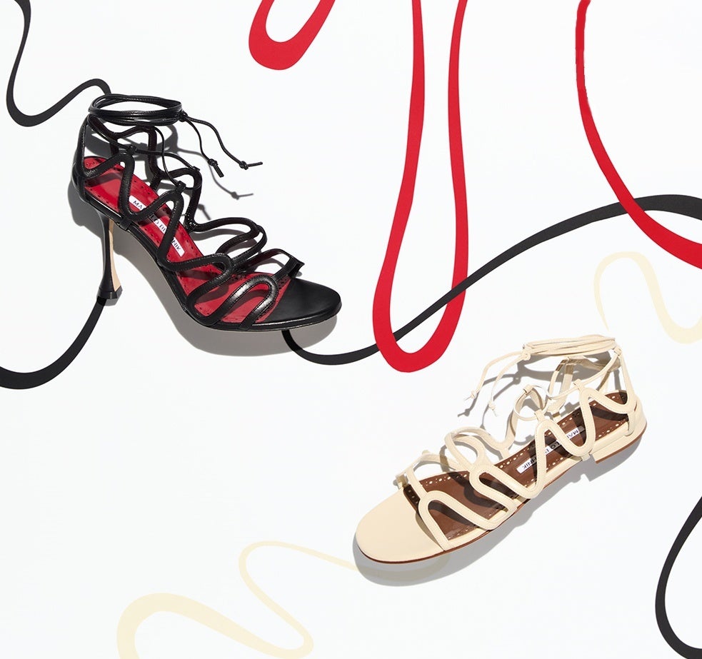 マノロ ブラニクの2025年春夏コレクションからレザーのラインが渦巻くサンダルが登場