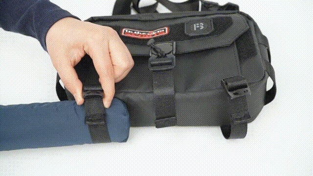 底部にはストラップを配置。折りたたみ傘やカメラの三脚、水筒やペットボトルなどを持ち運べます。