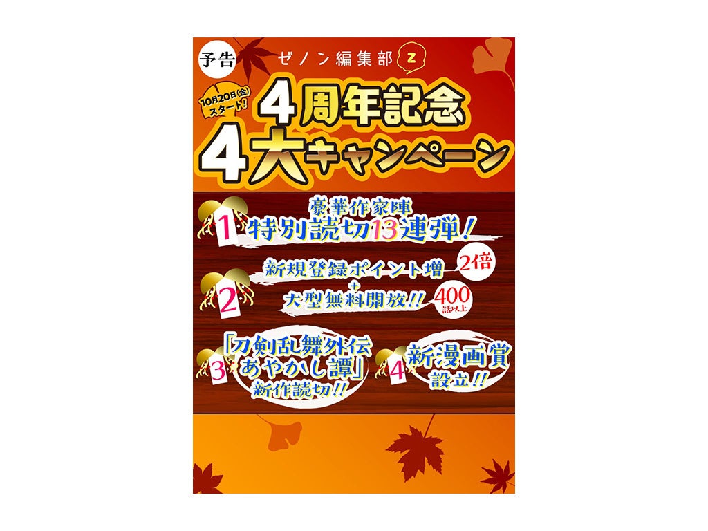 株式会社コアミックス(東京都武蔵野市)が運営するWEBゼノン編集部にて、10月20日より4周年記念4大キャンペーンを開催することが決定致しました。