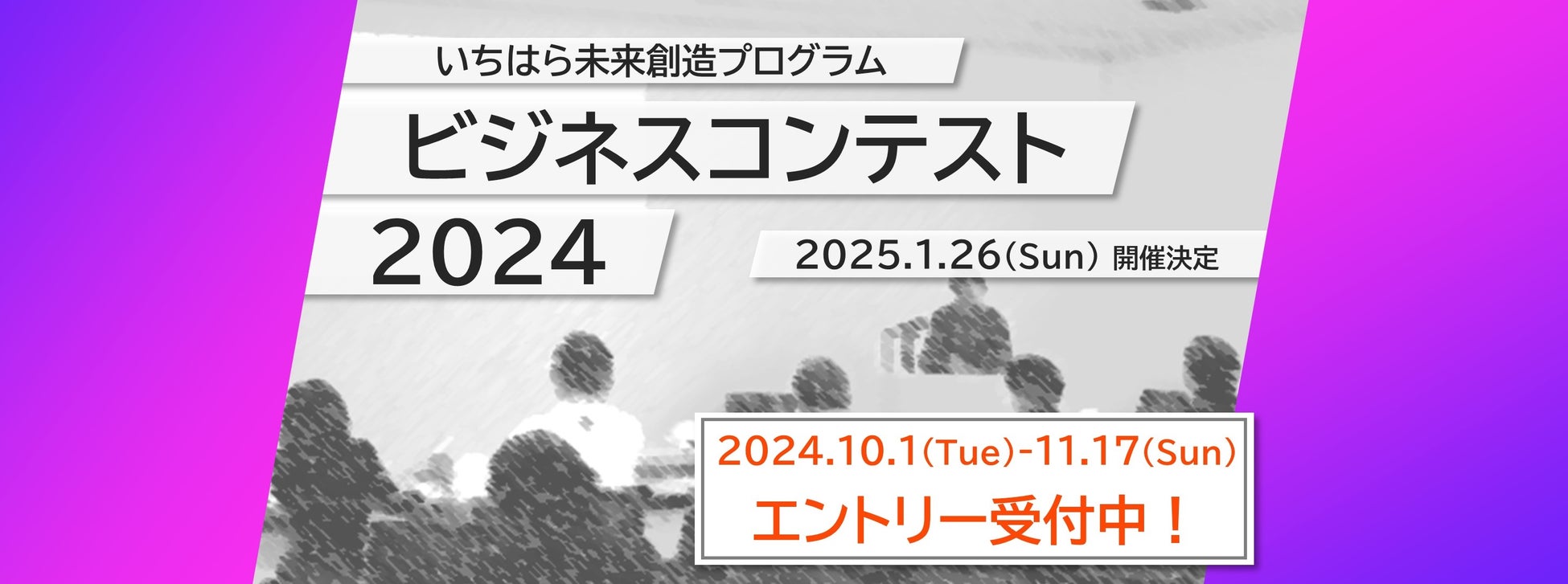 市原市を基盤にして、また、市原市の地域資源を活かして地域課題を解決し地域を活性化したい、という思いを持つ方のチャレンジを後押しするため、いちはら未来創造プログラム「ビジネスコンテスト2024」を開催します。コンテスト入賞者には、賞金やビジネスプレーヤー同士の交流機会の提供、起業・創業に向けた伴走支援など、多彩なメニューでビジネスの実現を支援します。